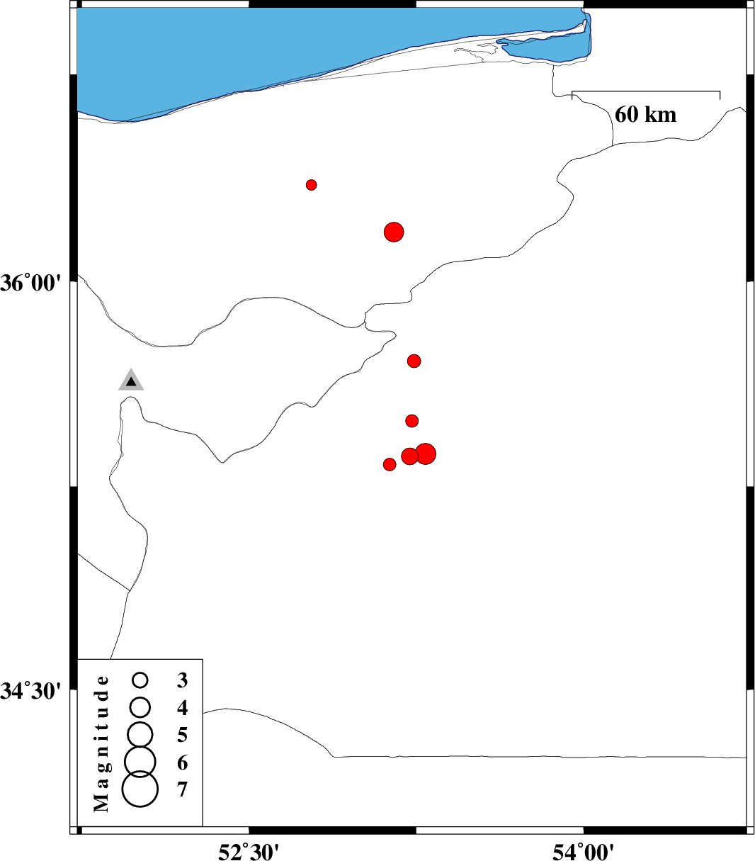 | 2012/05/07 | 09:14:56.1 | 13:44:56.1 | 35.49 | 53.23 | 18 | ML:2.6 | Semnan Province, 18 km West of Semnan | ||
