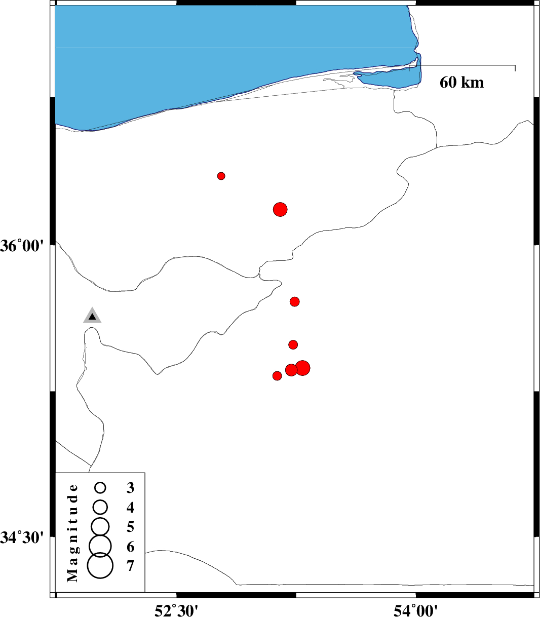 | 2012/05/07 | 09:14:56.1 | 13:44:56.1 | 35.49 | 53.23 | 18 | ML:2.6 | Semnan Province, 18 km West of Semnan | ||