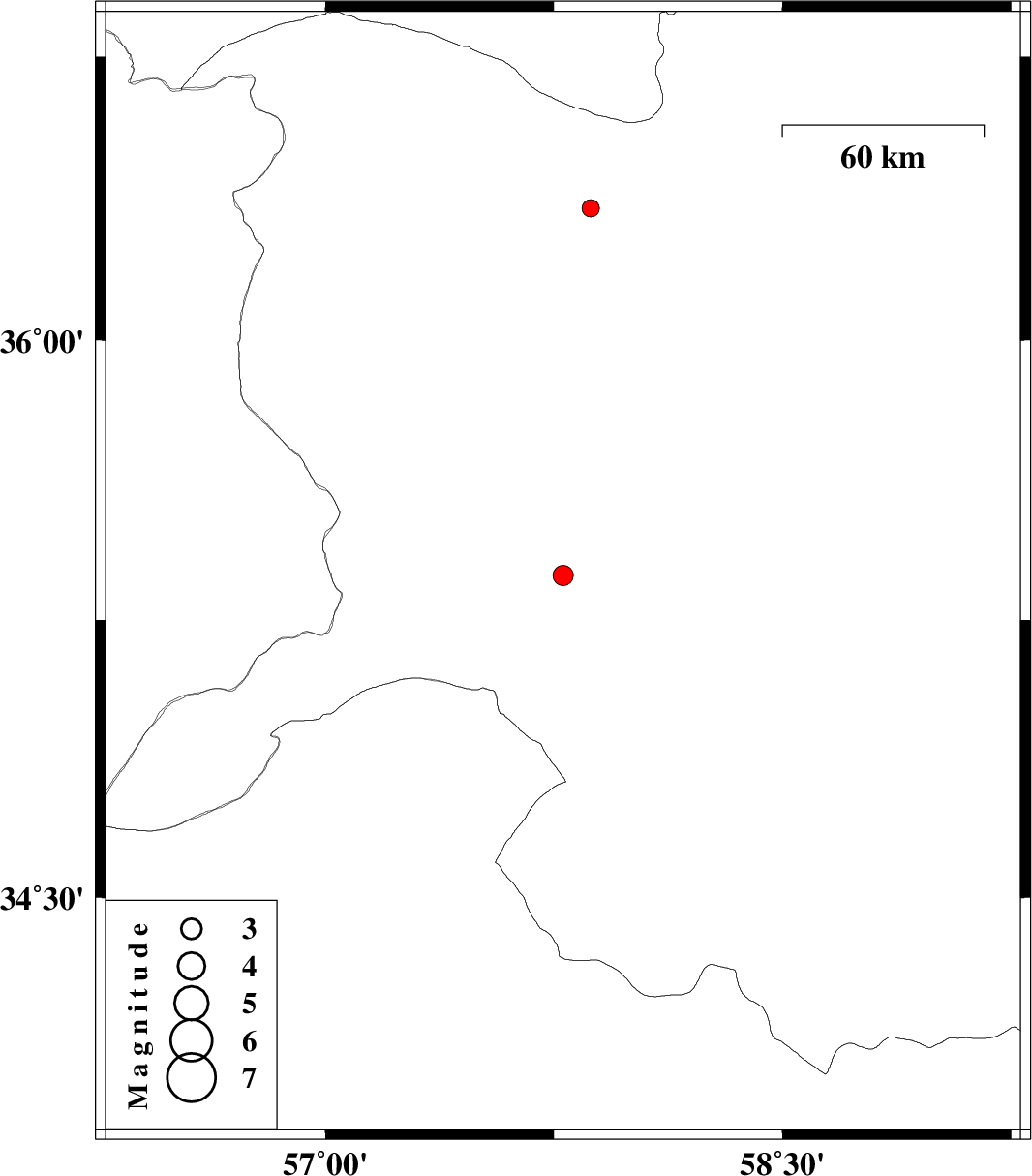 | 2012/05/07 | 09:42:38.4 | 14:12:38.4 | 35.37 | 57.78 | 15 | ML:2.9 | Khorasan(center) Province, 20 km North-West of Bardeskan | ||