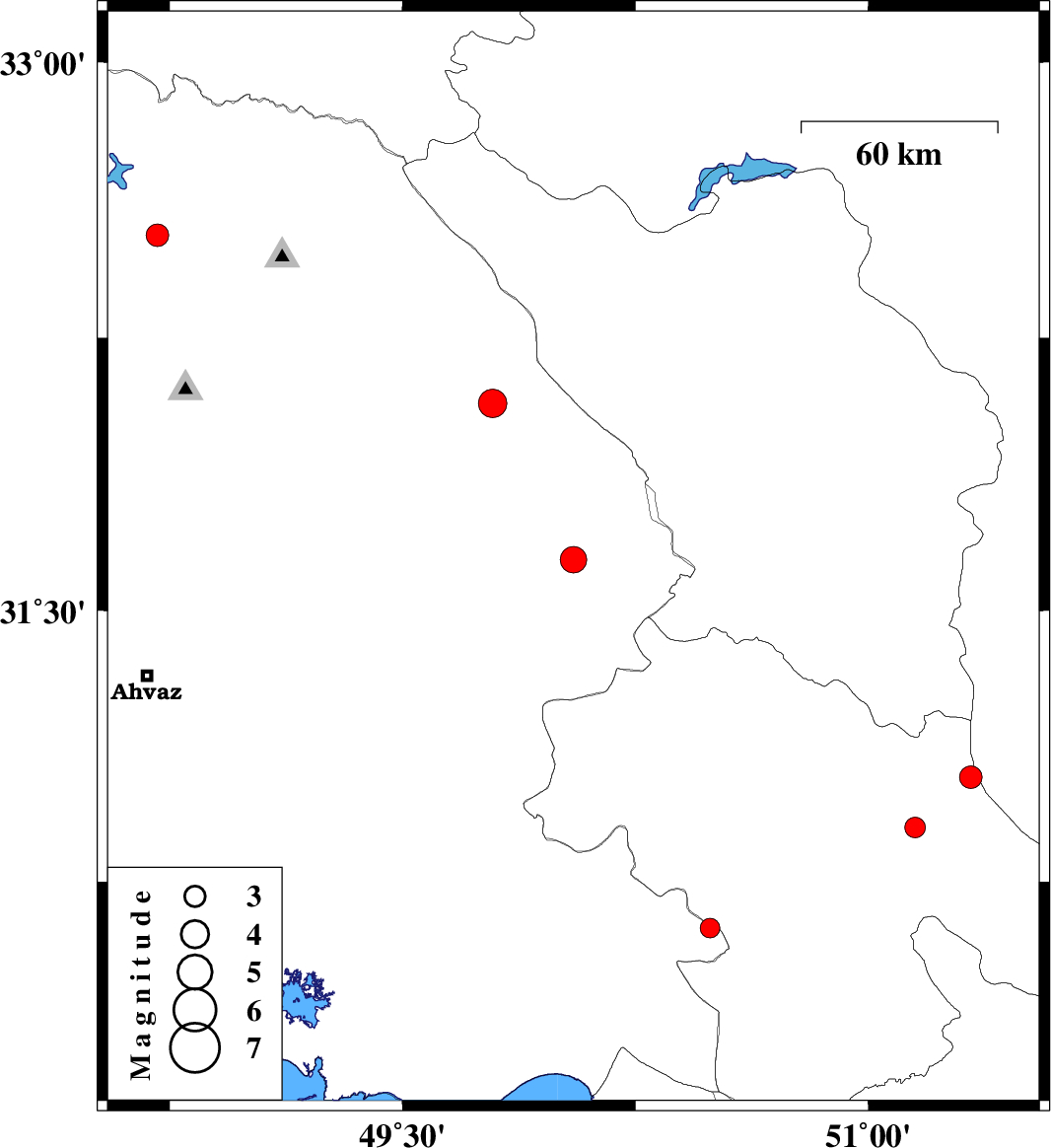 | 2012/05/07 | 12:54:21.4 | 17:24:21.4 | 31.64 | 50.05 | 15 | ML:3.8 | Khoozestan Province, 20 km North-East of Bagh Malek | ||