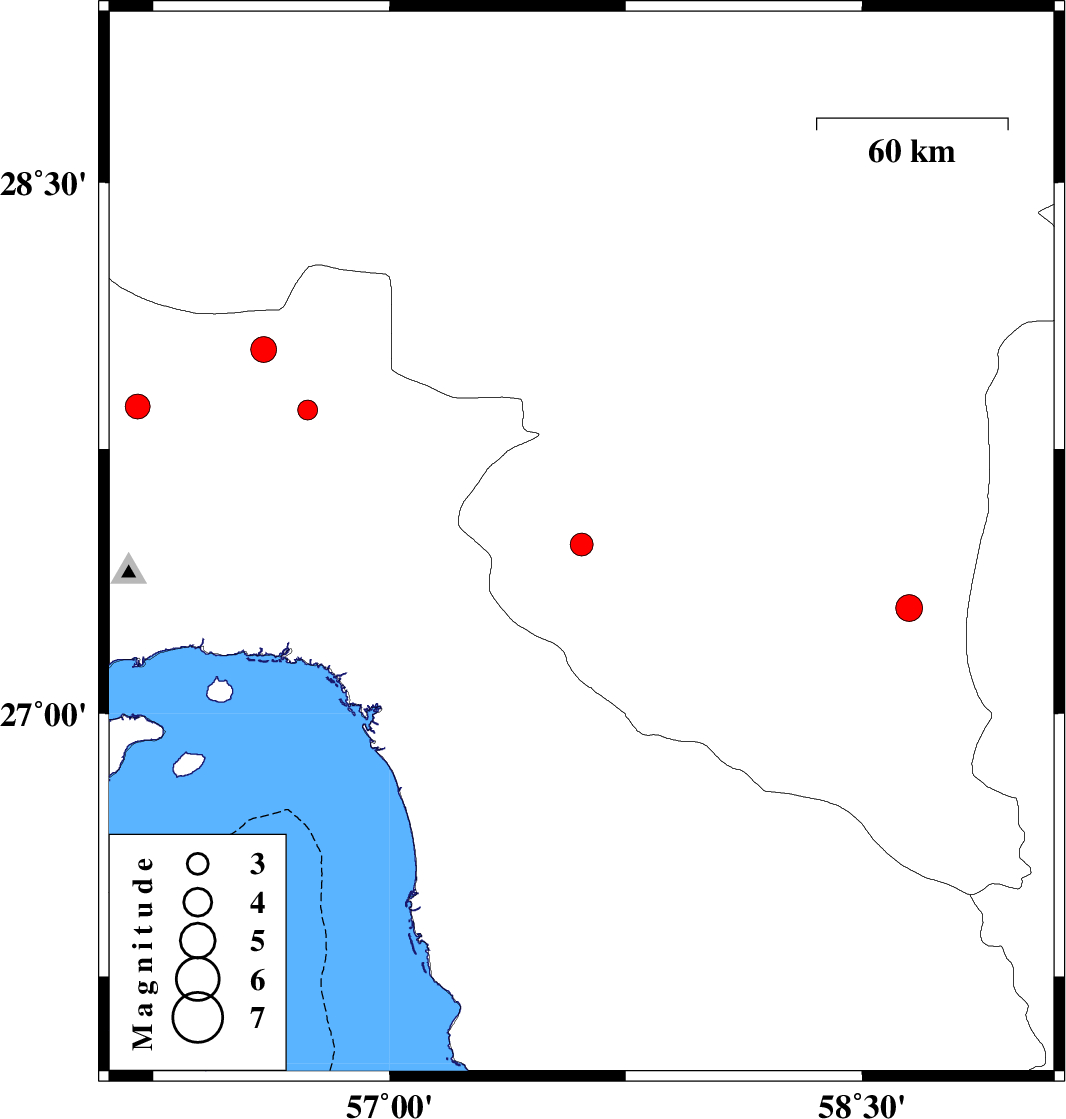 | 2012/05/07 | 00:29:11.4 | 04:59:11.4 | 27.3 | 58.65 | 15 | ML:3.8 | Kerman Province, 114 km South-East of Manujan | ||