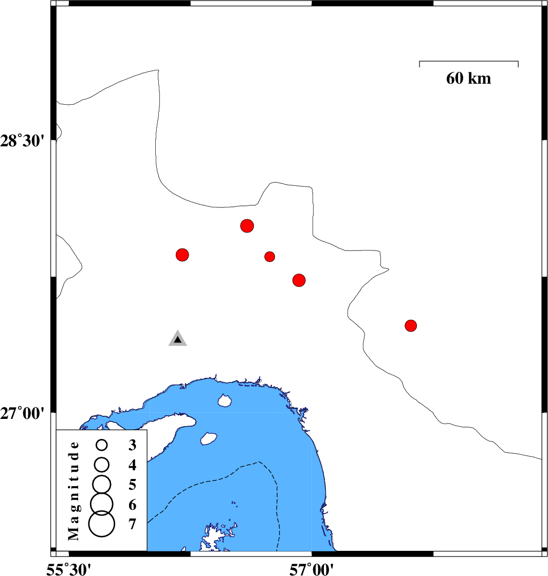 | 2012/05/02 | 08:07:36.0 | 12:37:36.0 | 27.86 | 56.74 | 14 | ML:2.8 | Hormozgan Province, 69 km North-West of Dehbarez | ||