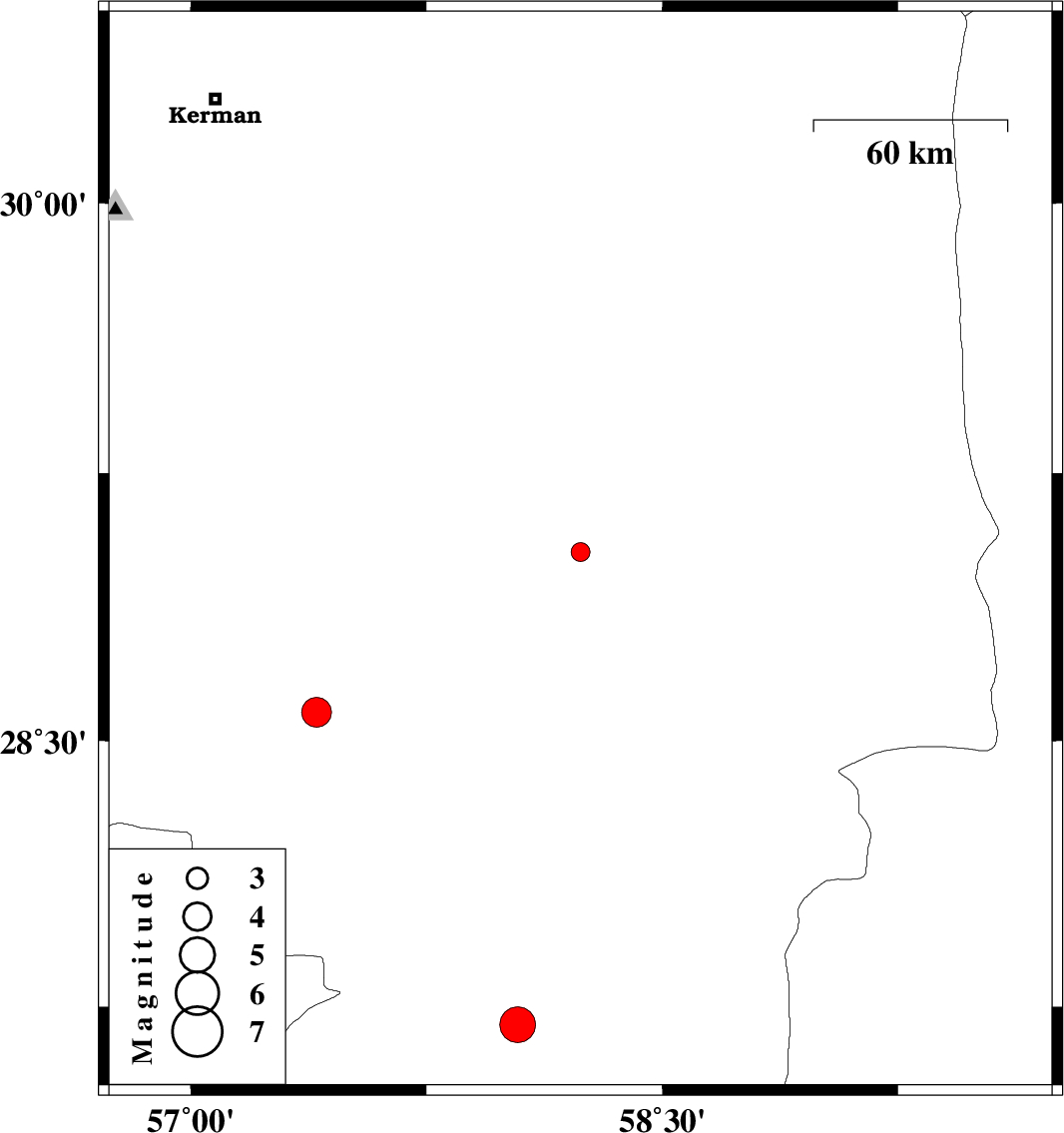 | 2012/04/29 | 11:58:38.4 | 16:28:38.4 | 28.58 | 57.4 | 31 | ML:4.2 | Kerman Province, 35 km West of Jiroft | ||