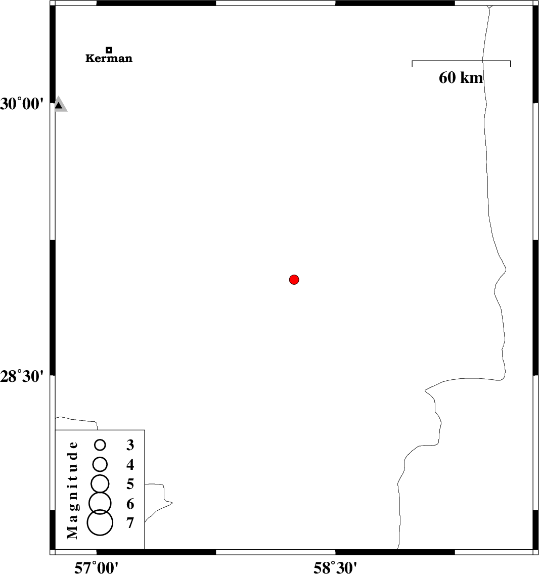 | 2012/05/09 | 07:23:26.0 | 11:53:26.0 | 29.03 | 58.24 | 17 | ML:2.7 | Kerman Province, 14 km West of Bam | ||