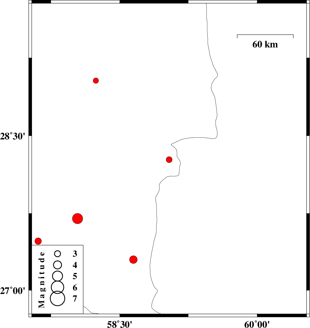 | 2012/04/18 | 17:40:36.2 | 22:10:36.2 | 27.7 | 58.04 | 15 | ML:5.1 | Kerman Province, 44 km South-East of Kahnuj |