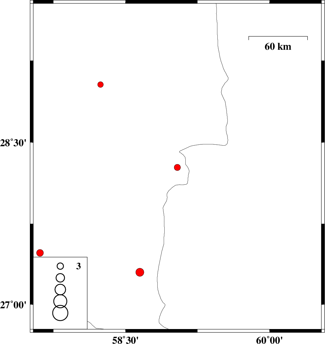 | 2012/05/11 | 00:38:00.3 | 05:08:00.3 | 28.27 | 59.04 | 14 | ML:2.9 | Kerman Province, 114 km South-East of Bam | ||