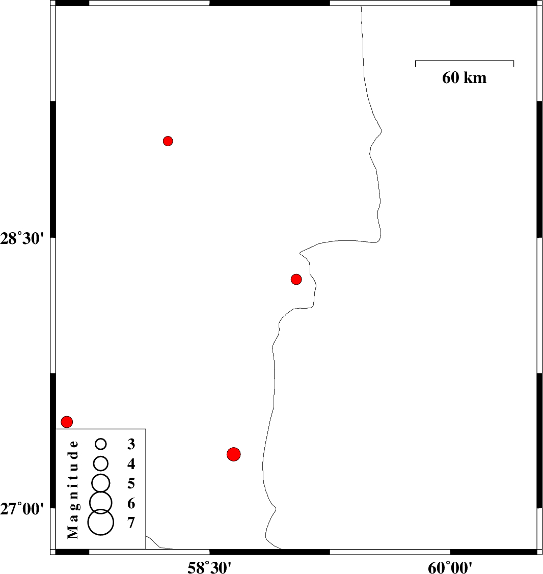 | 2012/05/07 | 00:29:11.4 | 04:59:11.4 | 27.3 | 58.65 | 15 | ML:3.8 | Kerman Province, 114 km South-East of Manujan |