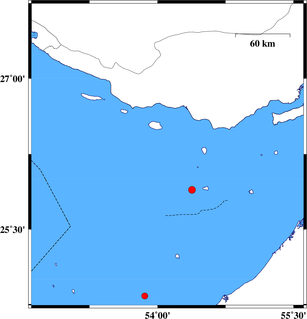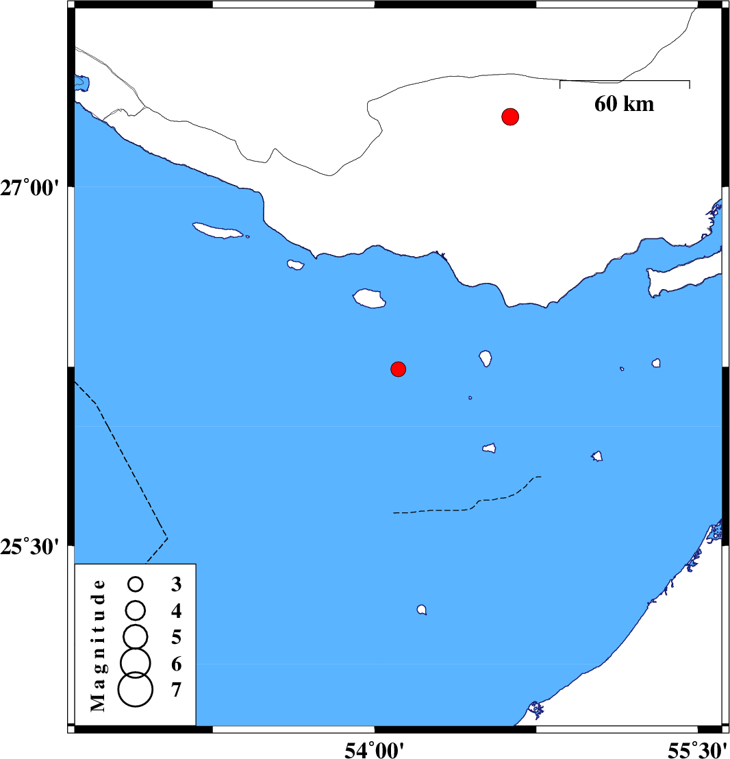 | 2012/05/11 | 06:41:25.4 | 11:11:25.4 | 26.24 | 54.11 | 15 | ML:3.1 | Persian Gulf, 81 km South-West of Bandar-e lengeh | ||