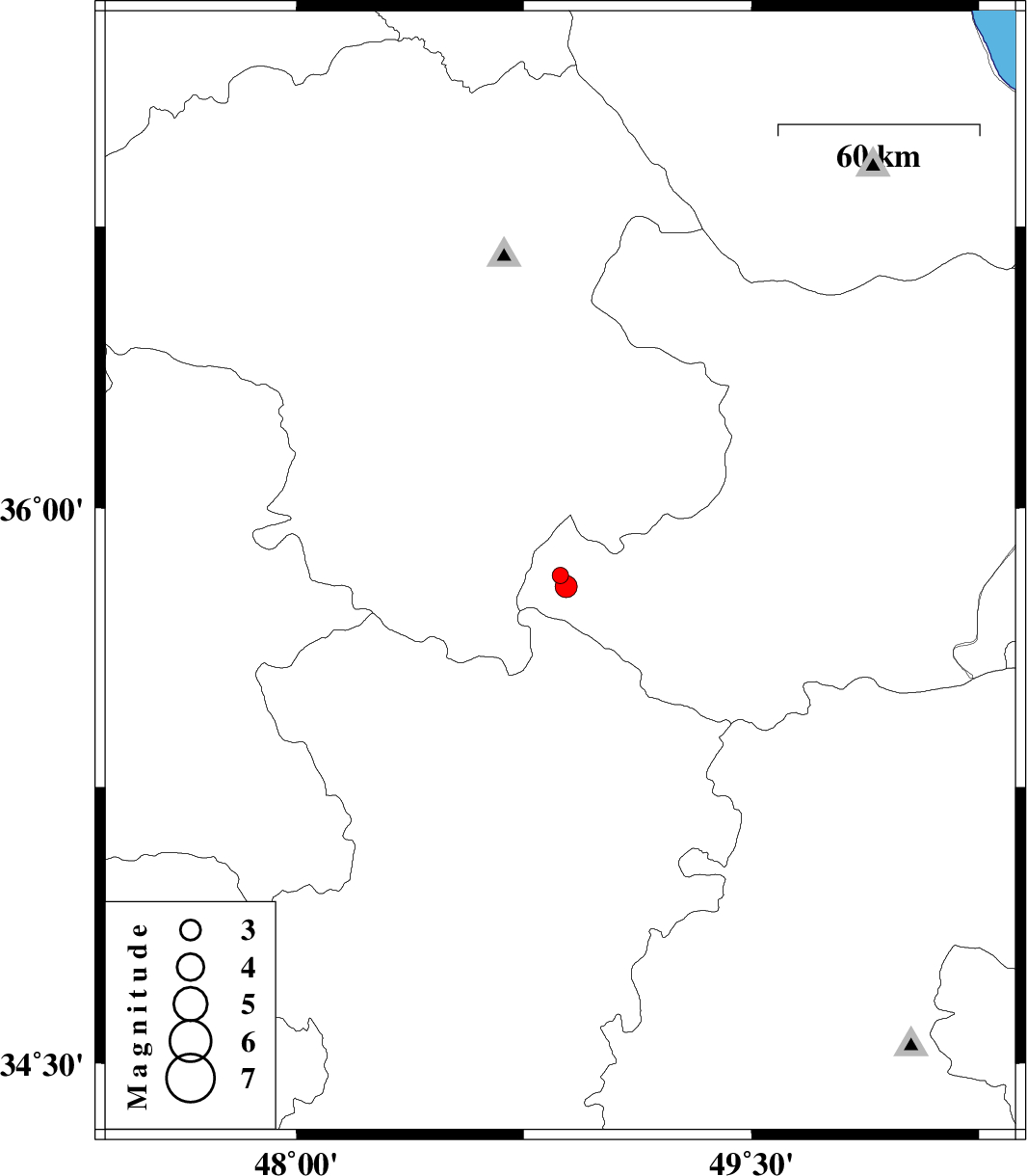 | 2012/05/11 | 13:23:56.9 | 17:53:56.9 | 35.79 | 48.89 | 14 | ML:3.3 | Ghazvin Province, 48 km North-West of Razan |