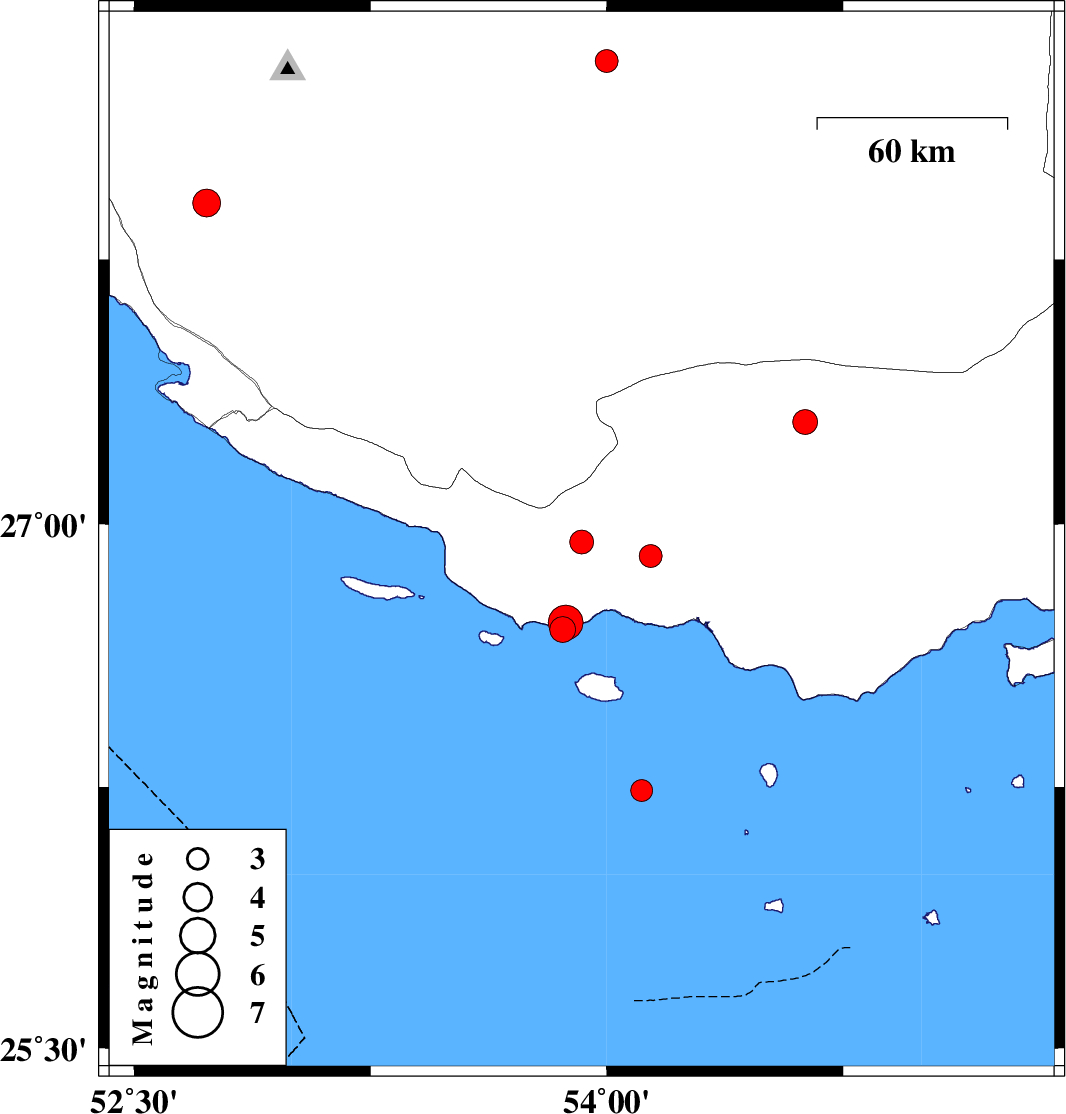 | 2012/05/13 | 18:31:17.4 | 23:01:17.4 | 26.7 | 53.86 | 18 | ML:3.7 | Persian Gulf, 75 km South-West of Bastak | ||