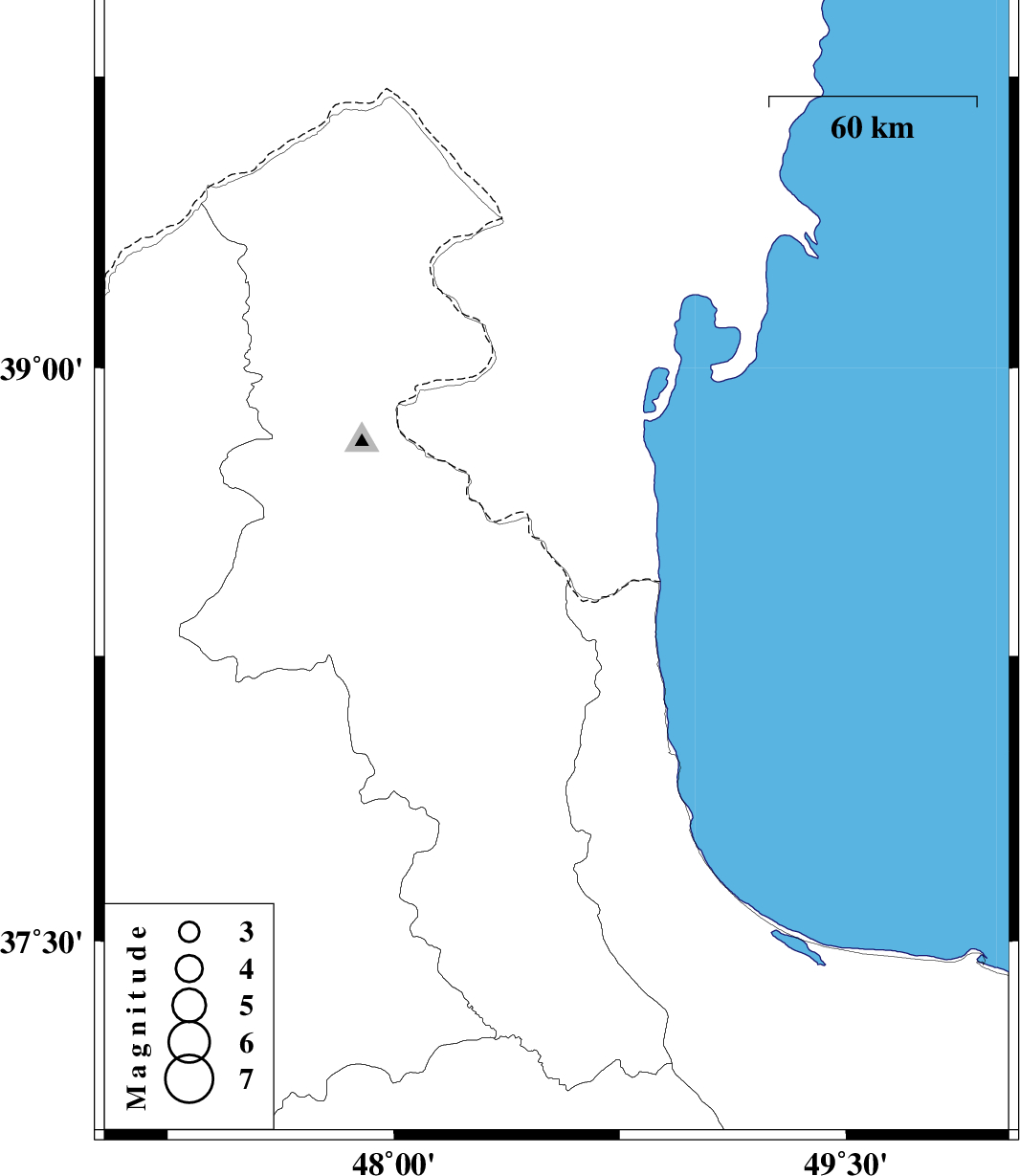 | 2012/05/14 | 06:46:23.1 | 11:16:23.1 | 38.5 | 48.54 | 14 | ML:3.5 | Ardebil Province, 10 km Namin |