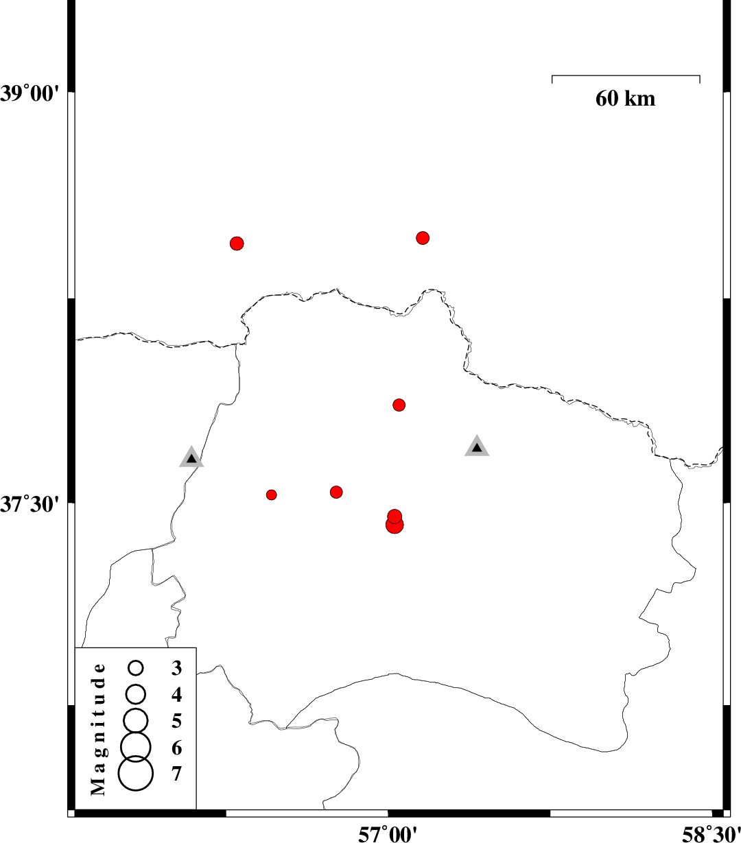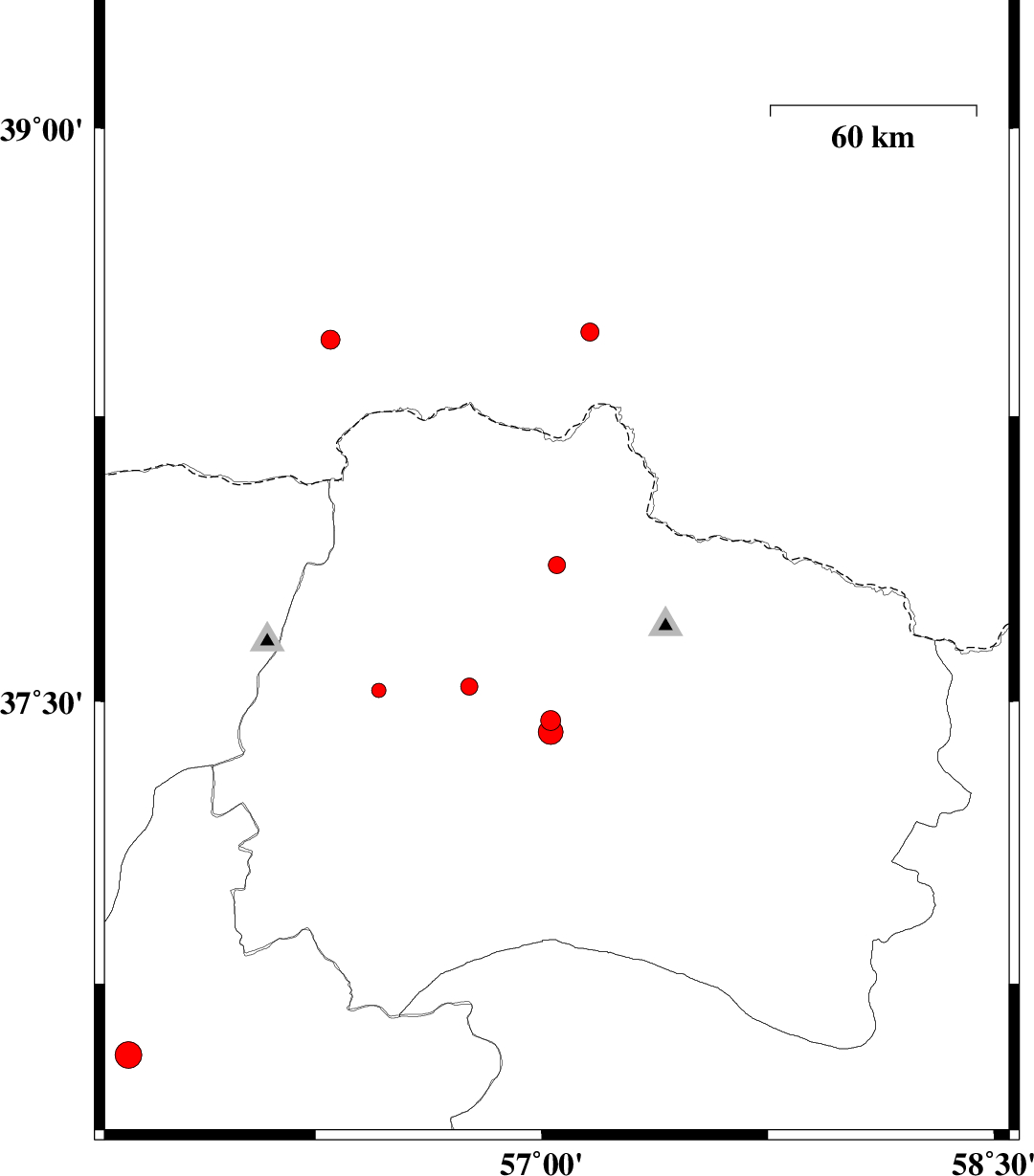| 2012/04/19 | 18:01:00.3 | 22:31:00.3 | 37.45 | 57.03 | 17 | ML:2.9 | Khorasan(north) Province, 14 km Ashkhaneh | ||