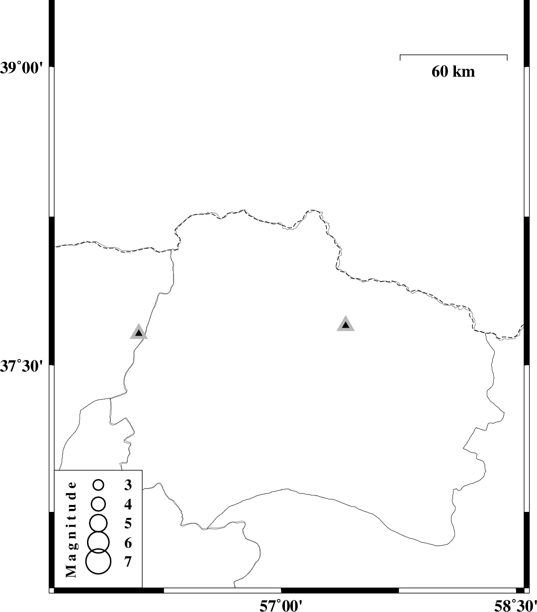 | 2012/05/16 | 15:15:18.0 | 19:45:18.0 | 37.86 | 57.05 | 14 | ML:2.6 | Khorasan(north) Province, 36 km North-East of Ashkhaneh |