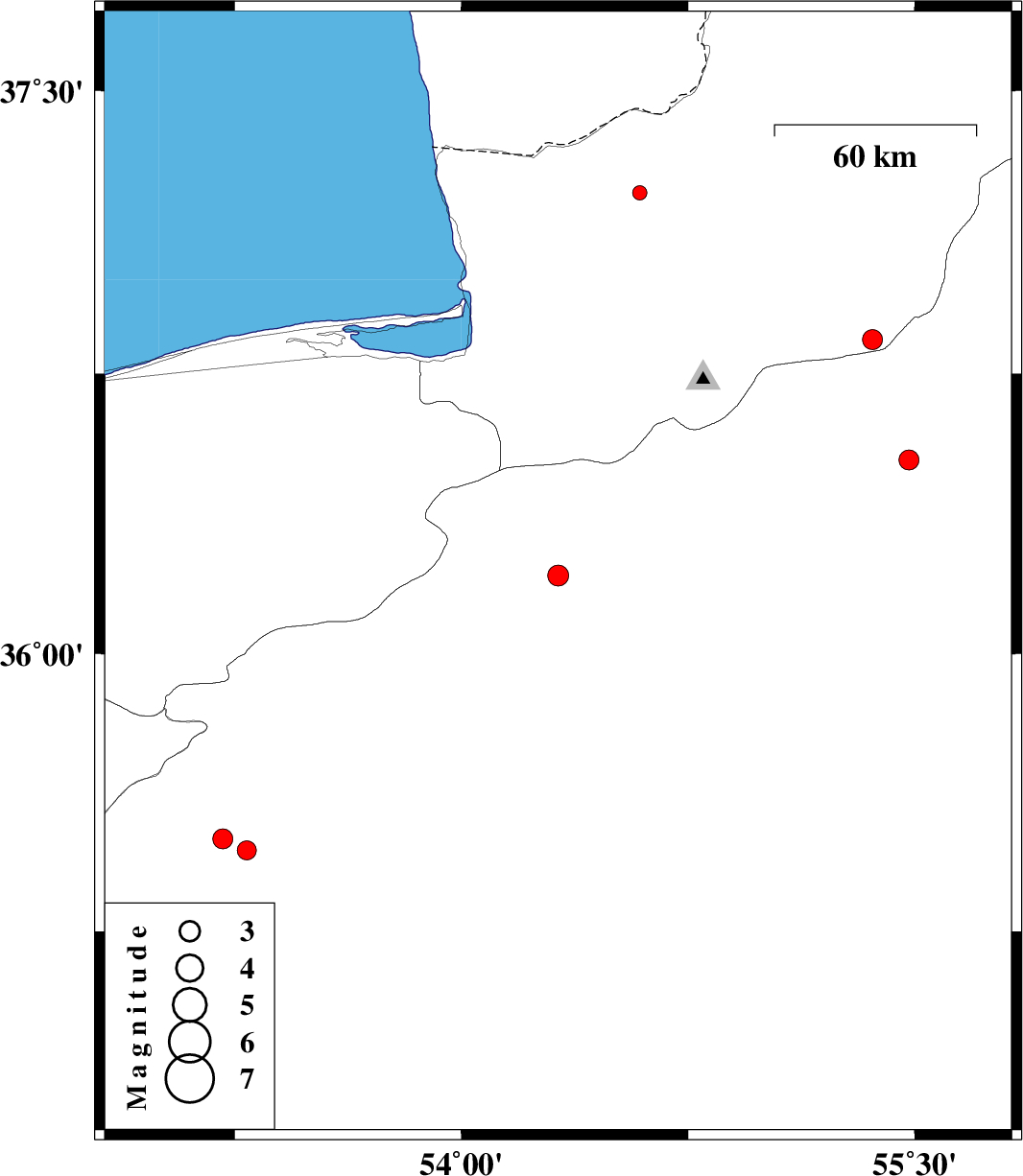 | 2012/05/17 | 07:51:20.6 | 12:21:20.6 | 36.84 | 55.36 | 8 | ML:2.9 | Golestan Province, 27 km South-East of Ramian | ||