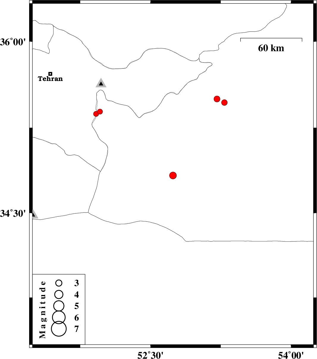 | 2012/05/11 | 07:45:05.8 | 12:15:05.8 | 35.5 | 53.21 | 16 | ML:2.9 | Semnan Province, 19 km West of Semnan |