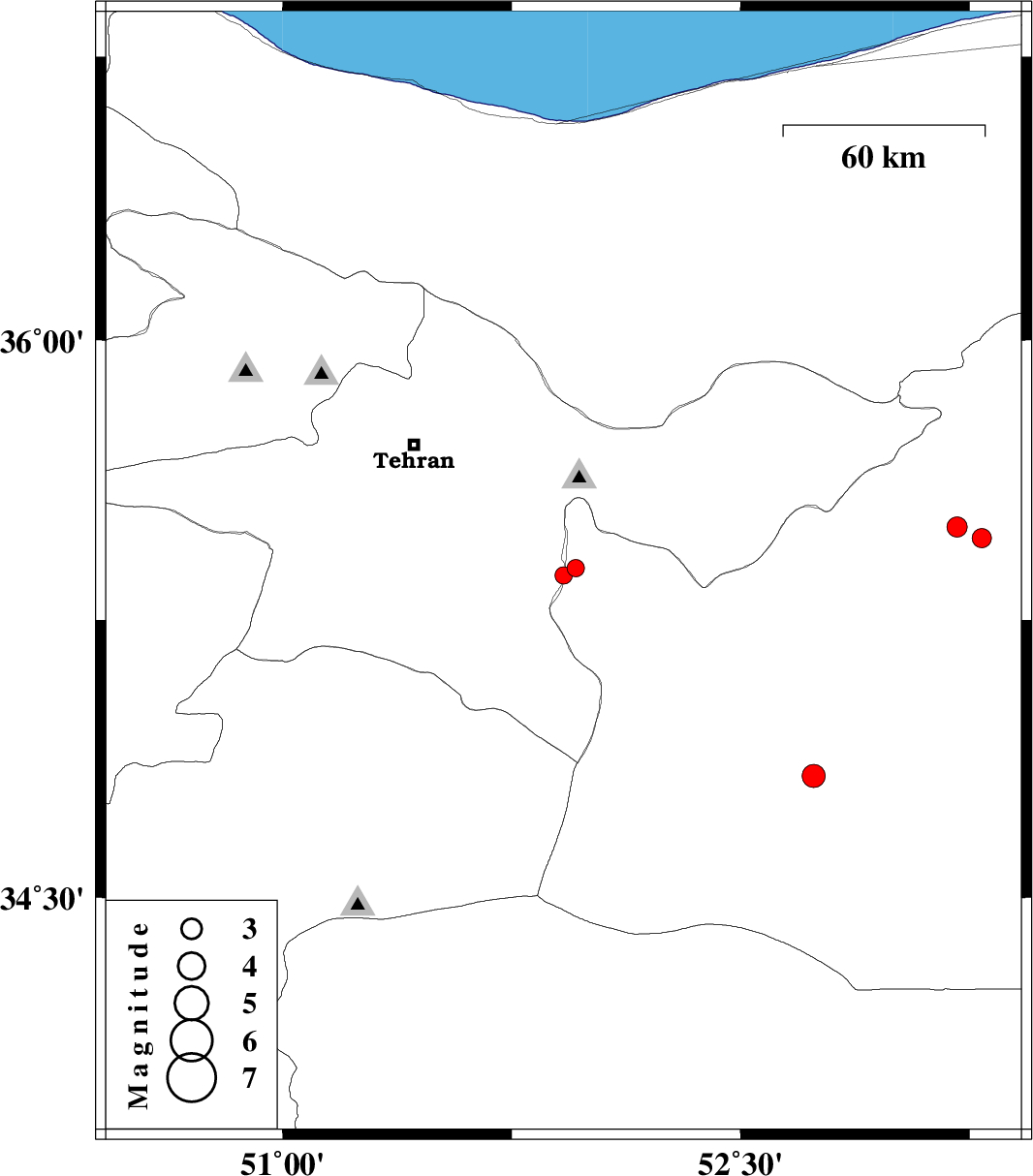 | 2012/05/18 | 07:13:54.9 | 11:43:54.9 | 34.83 | 52.74 | 17 | ML:3.4 | Semnan Province, 57 km South-East of Garmsar | ||
