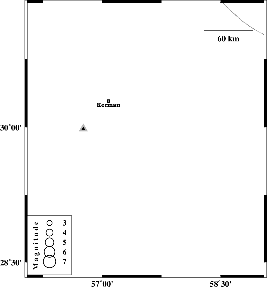 | 2012/05/19 | 01:46:35.4 | 06:16:35.4 | 29.86 | 57.55 | 37 | ML:3 | Kerman Province, 66 km South-East of Kerman |