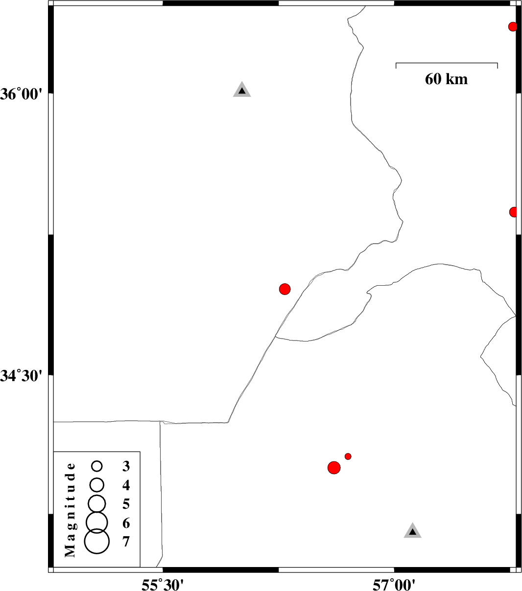 | 2012/05/04 | 17:49:31.7 | 22:19:31.7 | 34.06 | 56.7 | 14 | ML:1.9 | Yazd Province, 55 km North-West of Tabas | ||