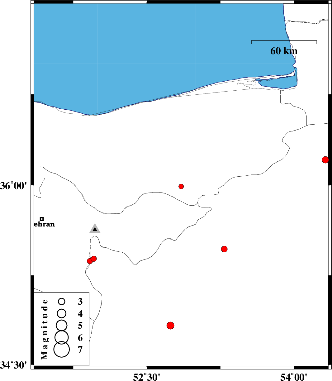 | 2012/05/18 | 07:13:54.9 | 11:43:54.9 | 34.83 | 52.74 | 17 | ML:3.4 | Semnan Province, 57 km South-East of Garmsar | ||