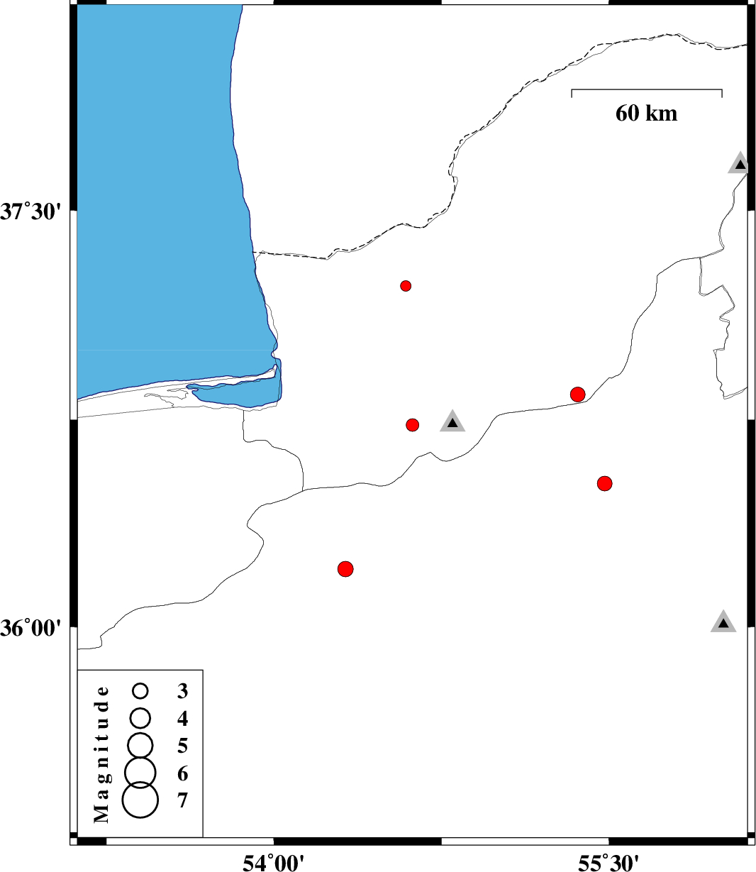 | 2012/05/17 | 01:18:57.9 | 05:48:57.9 | 36.52 | 55.48 | 14 | ML:3 | Semnan Province, 47 km North-East of Shahrud |