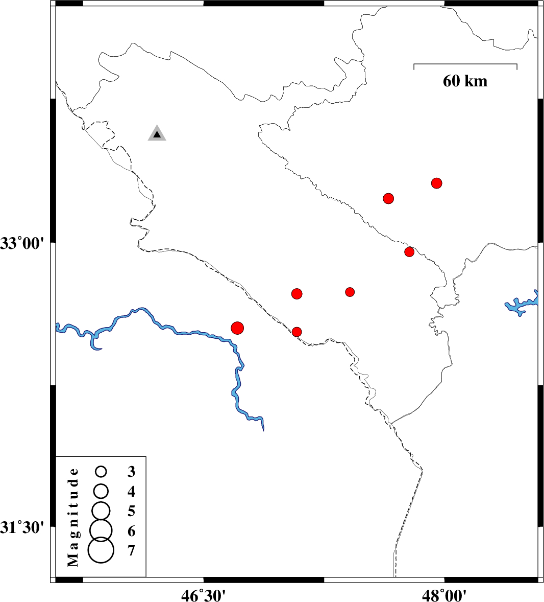 | 2012/05/21 | 20:34:26.8 | 01:04:26.8 | 32.55 | 46.71 | 14 | ML:3.5 | Iraq, 54 km South-West of Dehloran |