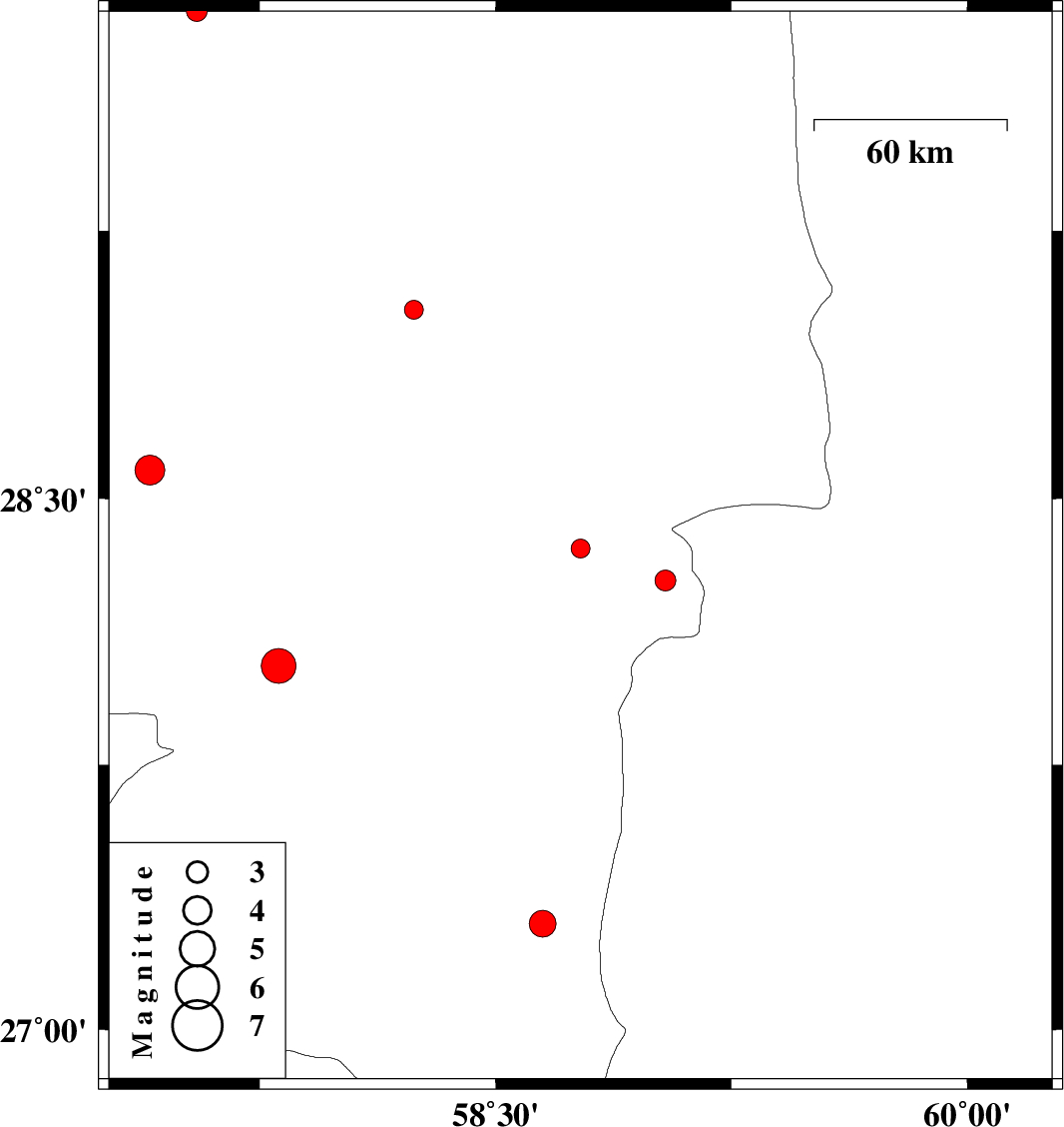| 2012/05/28 | 10:12:01.8 | 14:42:01.8 | 28.36 | 58.77 | 14 | ML:2.7 | Kerman Province, 92 km South-East of Bam | ||