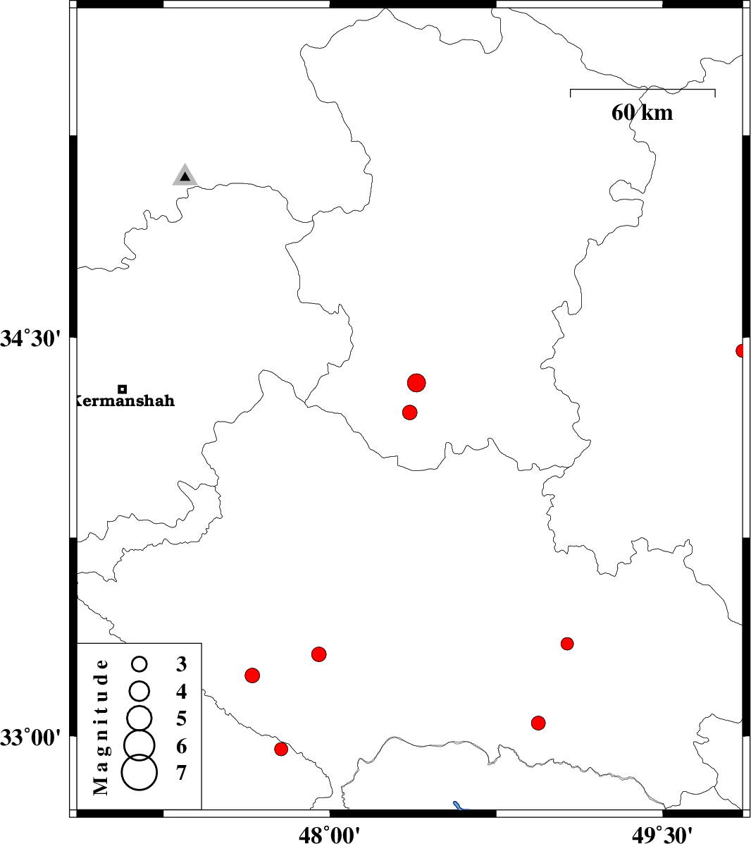 | 2012/05/23 | 04:03:47.5 | 08:33:47.5 | 32.95 | 47.78 | 15 | ML:2.7 | Ilam Province, 23 km South of Pol-e dokhtar |