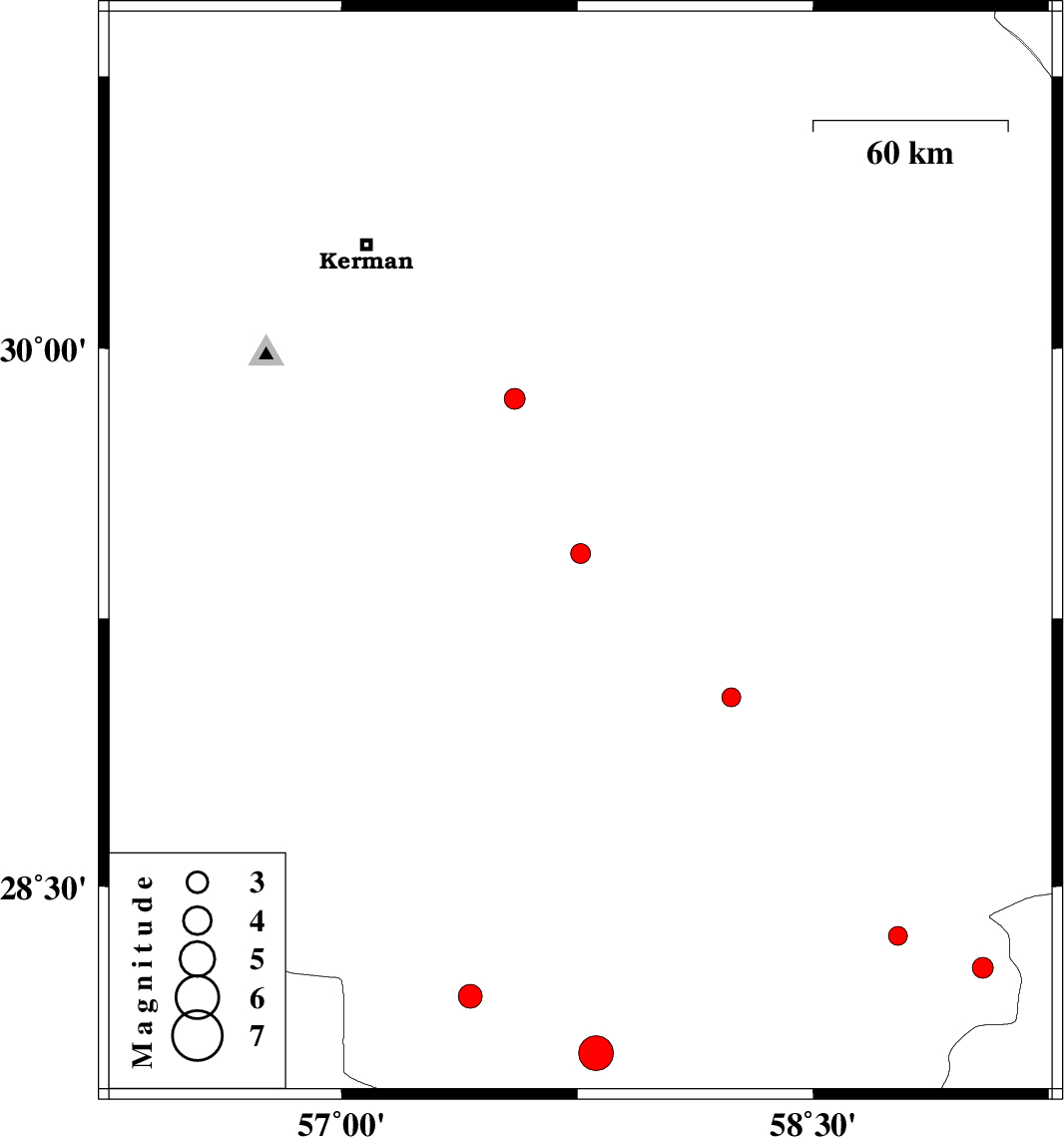 | 2012/05/28 | 10:12:01.8 | 14:42:01.8 | 28.36 | 58.77 | 14 | ML:2.7 | Kerman Province, 92 km South-East of Bam | ||