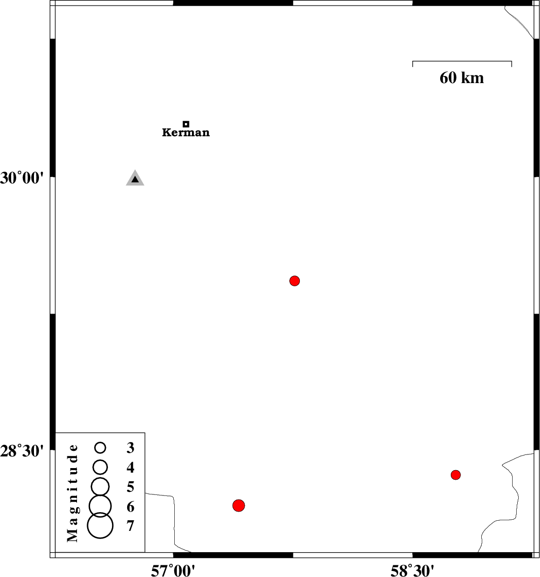 | 2012/05/28 | 10:12:01.8 | 14:42:01.8 | 28.36 | 58.77 | 14 | ML:2.7 | Kerman Province, 92 km South-East of Bam |