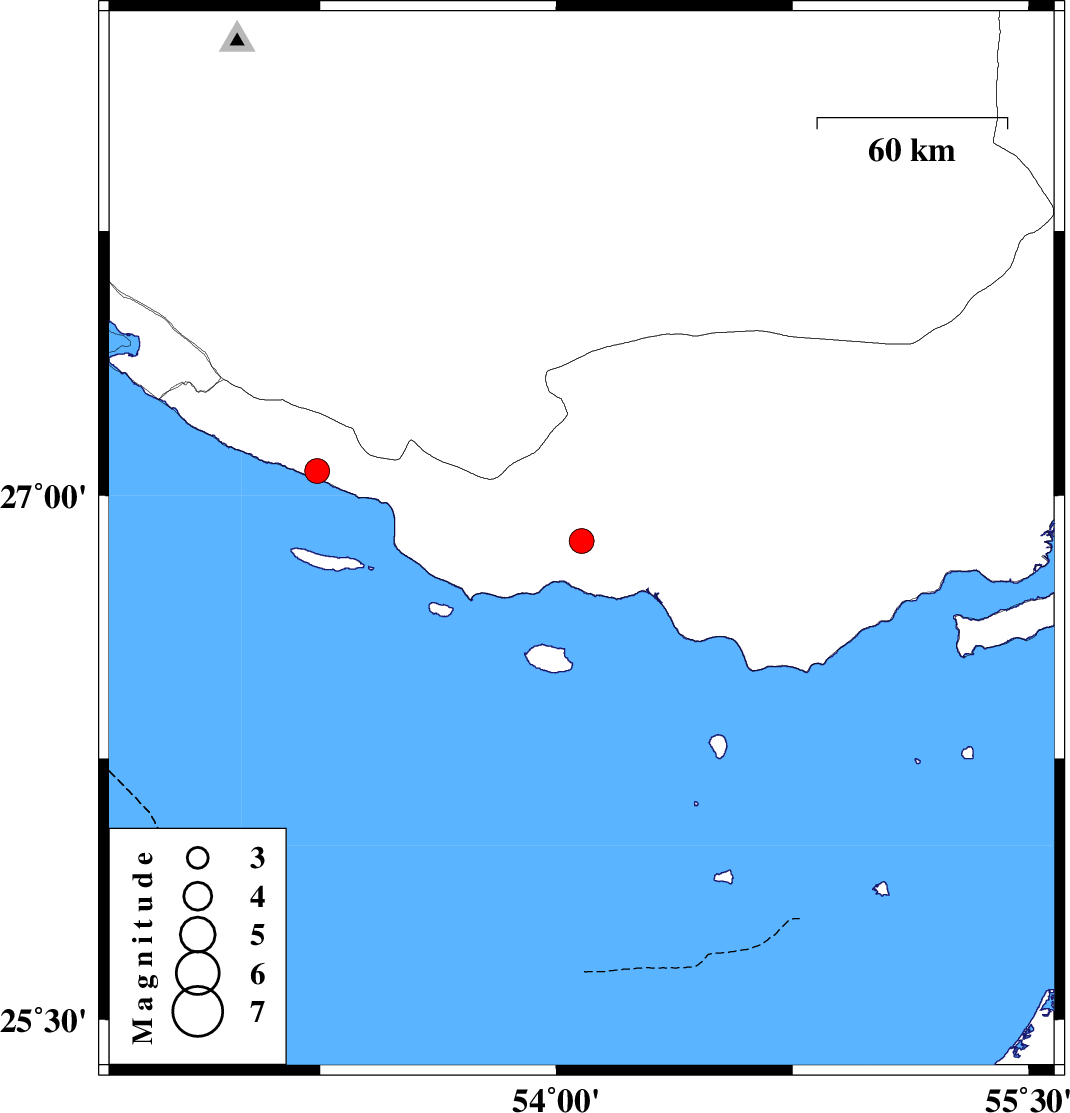 | 2012/05/25 | 01:25:32.4 | 05:55:32.4 | 26.87 | 54.08 | 14 | ML:2.8 | Hormozgan Province, 46 km South-West of Bastak |