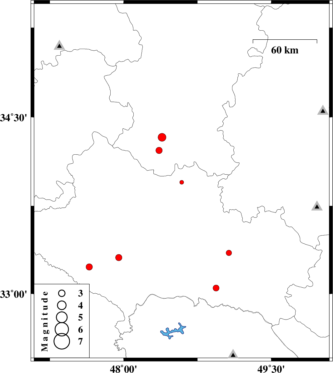| 2012/05/25 | 12:27:46.3 | 16:57:46.3 | 33.05 | 48.94 | 14 | ML:2.8 | Lorestan Province, 49 km South-West of Dorud |