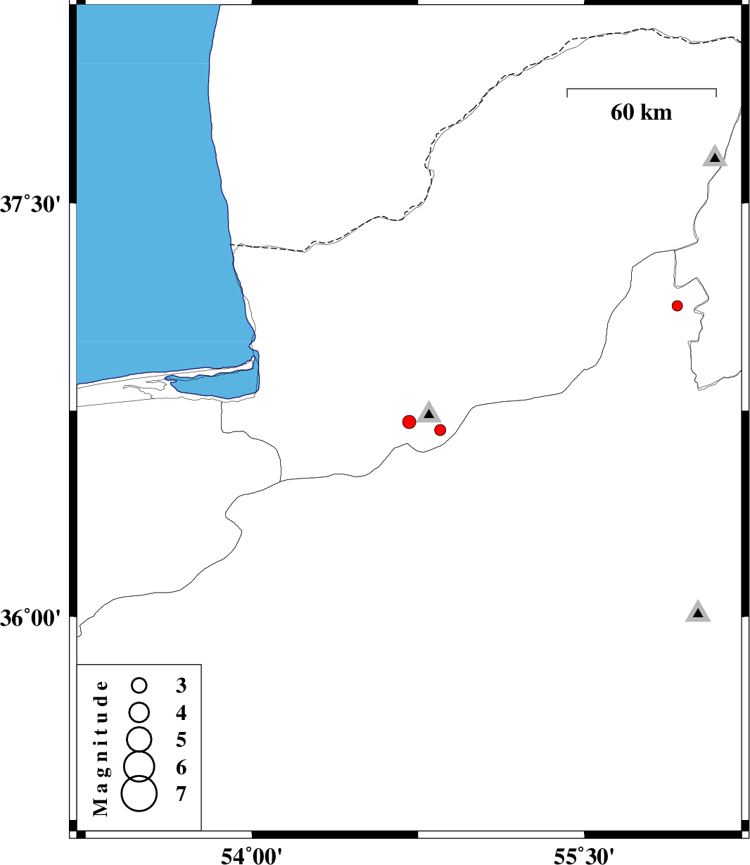| 2012/05/27 | 18:31:14.6 | 23:01:14.6 | 36.68 | 54.85 | 14 | ML:2.2 | Golestan Province, 25 km South of Ali Abad | ||