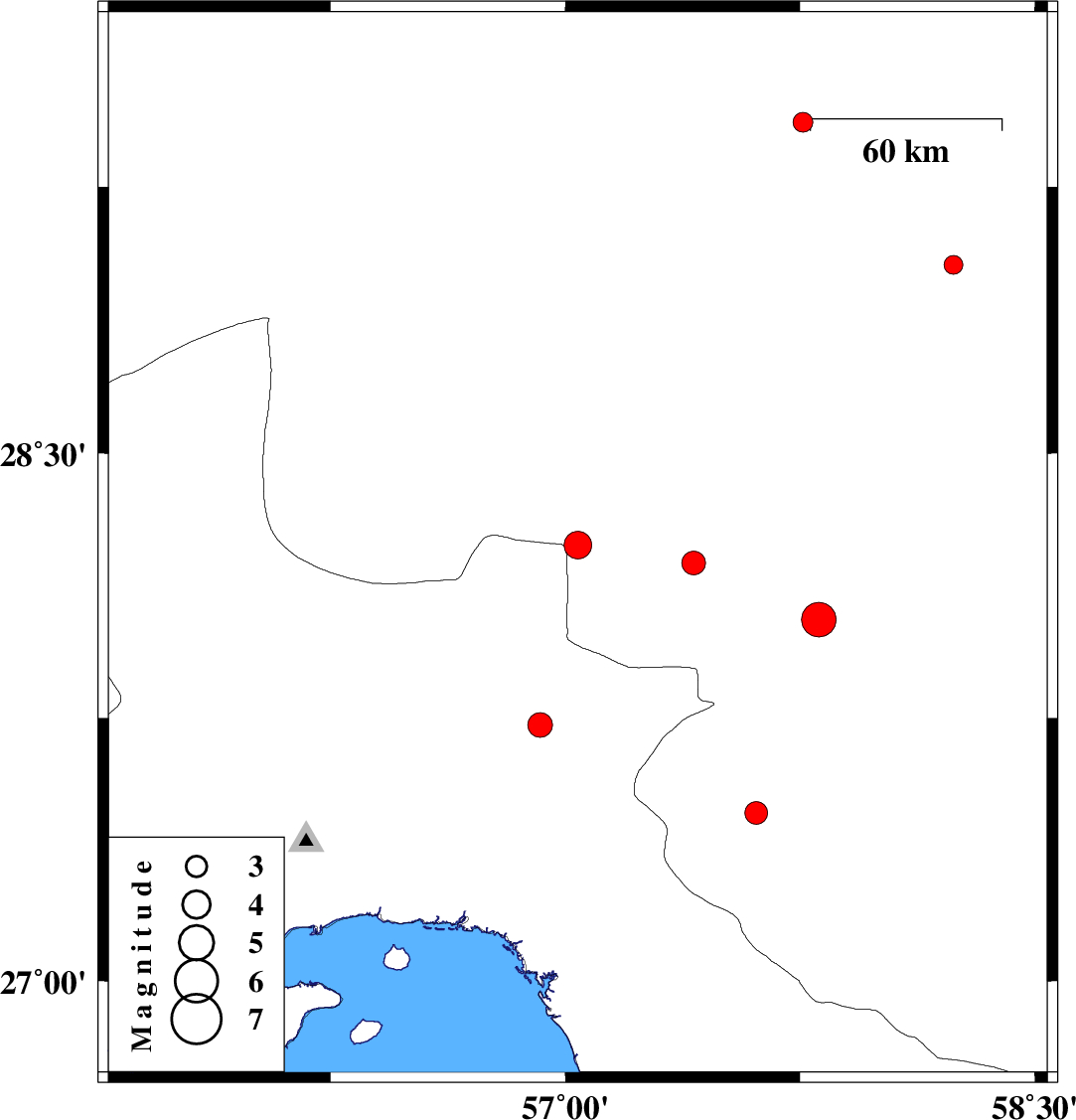 | 2012/06/04 | 03:58:09.8 | 08:28:09.8 | 28.24 | 57.04 | 29 | ML:4 | Kerman Province, 72 km North-West of Kahnuj | ||