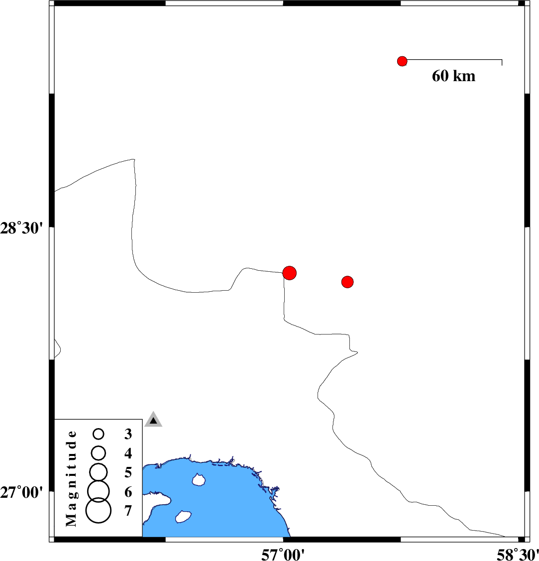 | 2012/05/29 | 18:43:53.1 | 23:13:53.1 | 28.19 | 57.41 | 14 | ML:3.4 | Kerman Province, 39 km North-West of Kahnuj |