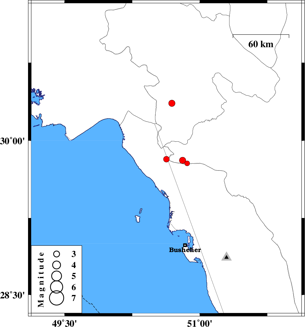 | 2012/06/04 | 13:40:31.7 | 18:10:31.7 | 29.81 | 50.81 | 40 | ML:3.2 | Fars Province, 38 km North-East of Bandar-e genaveh | ||