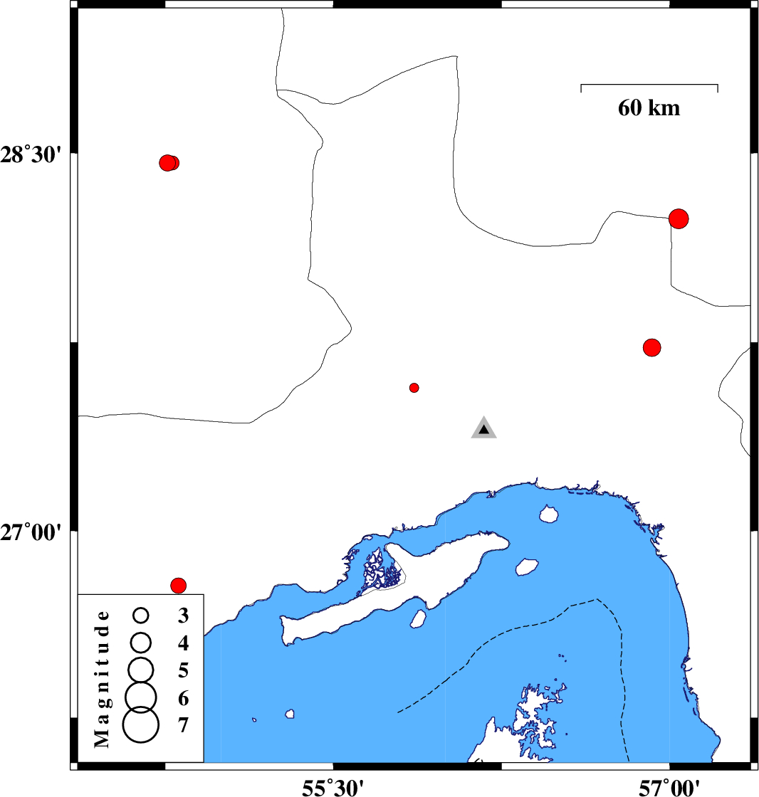 | 2012/06/03 | 16:52:59.7 | 21:22:59.7 | 26.78 | 54.81 | 31 | ML:3.1 | Hormozgan Province, 28 km North of Bandar-e lengeh | ||