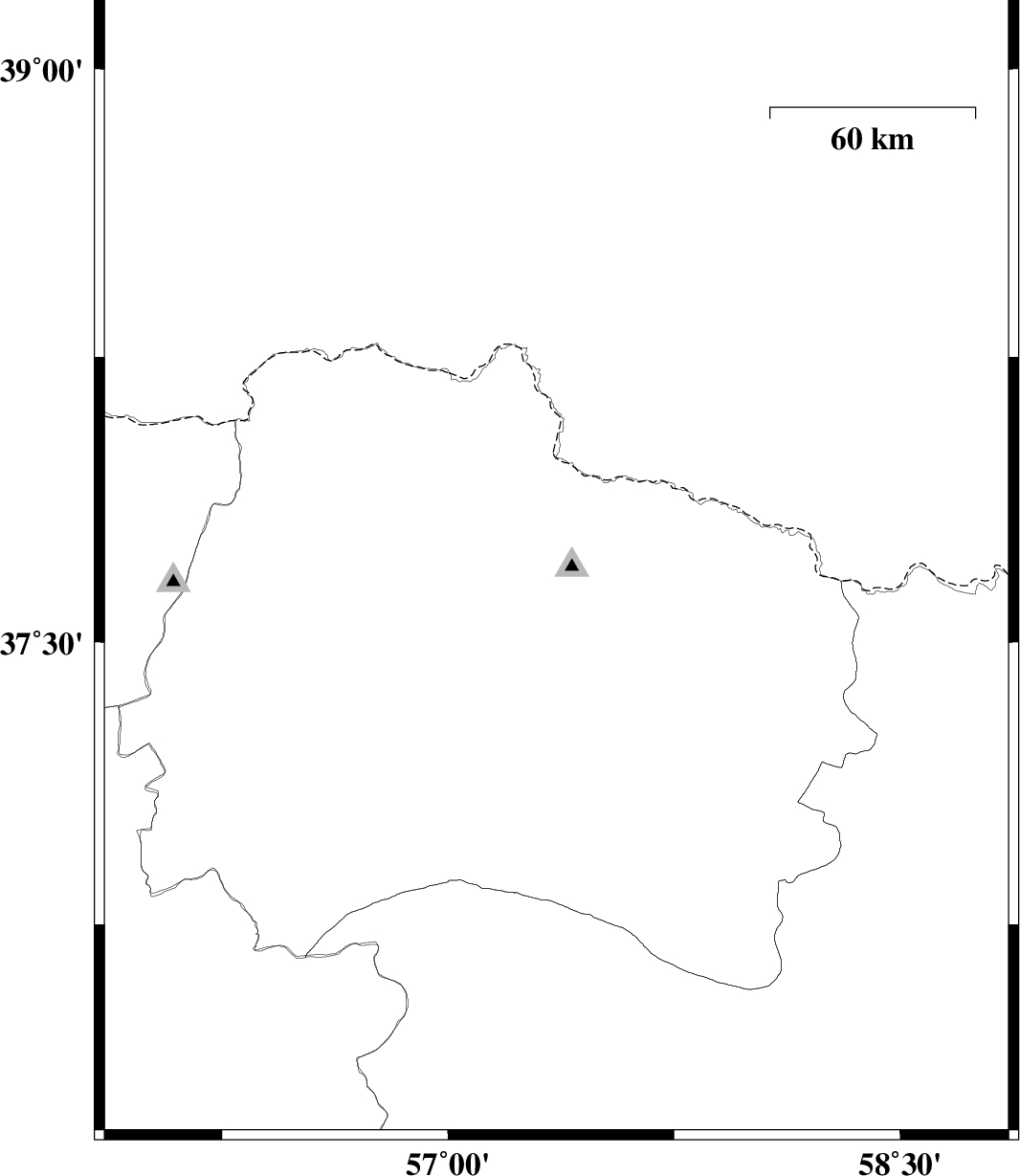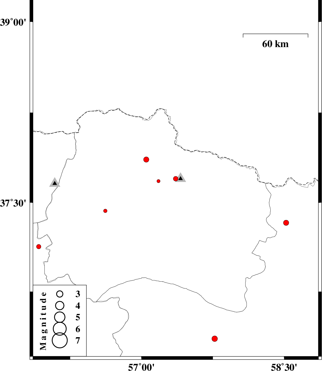 | 2012/06/05 | 06:04:34.3 | 10:34:34.3 | 37.68 | 57.18 | 14 | ML:1.6 | Khorasan(north) Province, 26 km North-West of Bojnurd | ||