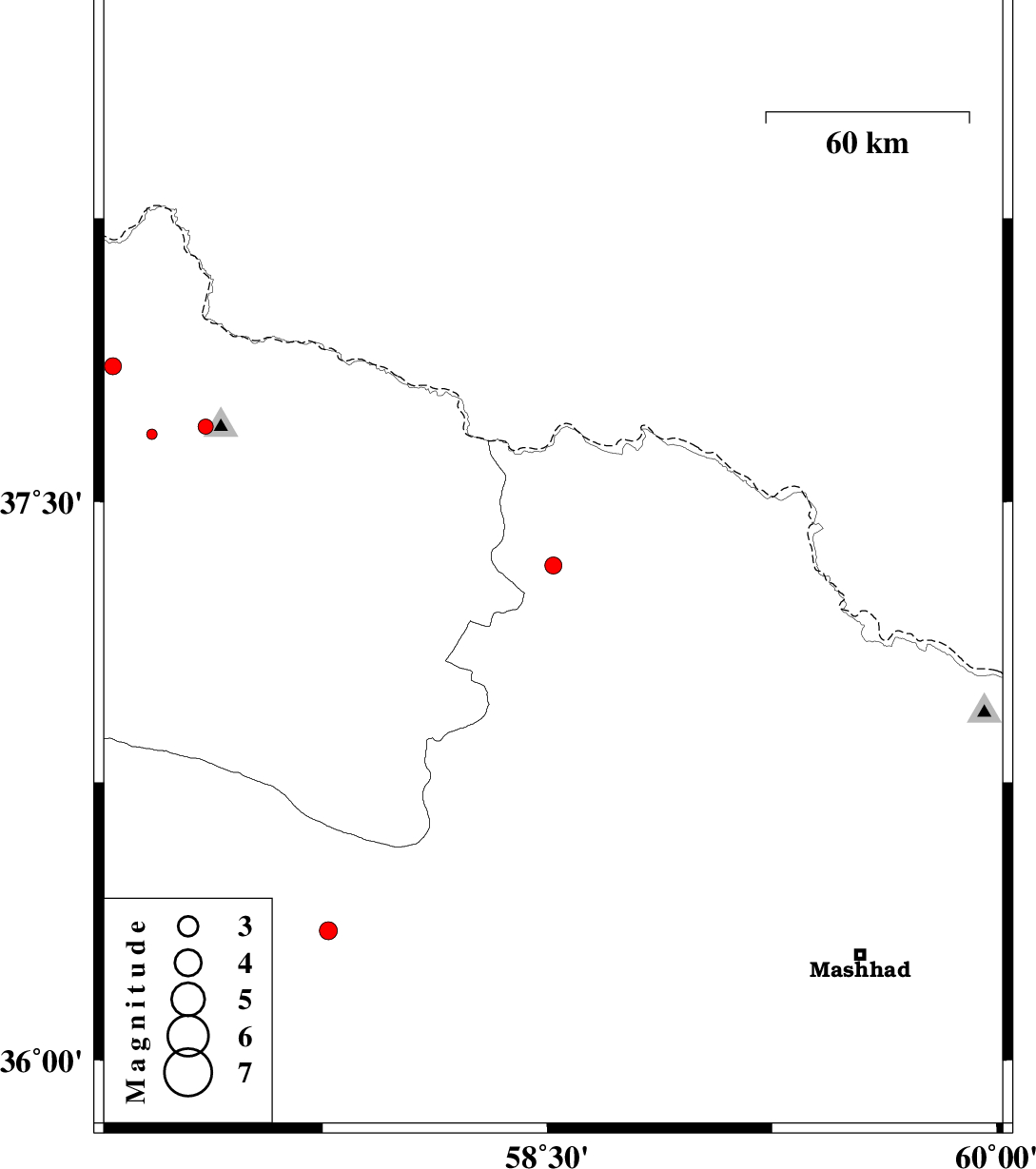 | 2012/06/05 | 06:04:34.3 | 10:34:34.3 | 37.68 | 57.18 | 14 | ML:1.6 | Khorasan(north) Province, 26 km North-West of Bojnurd | ||