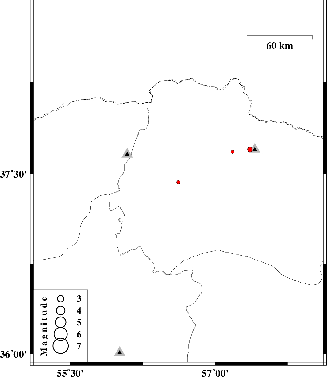 | 2012/06/05 | 06:04:34.3 | 10:34:34.3 | 37.68 | 57.18 | 14 | ML:1.6 | Khorasan(north) Province, 26 km North-West of Bojnurd |