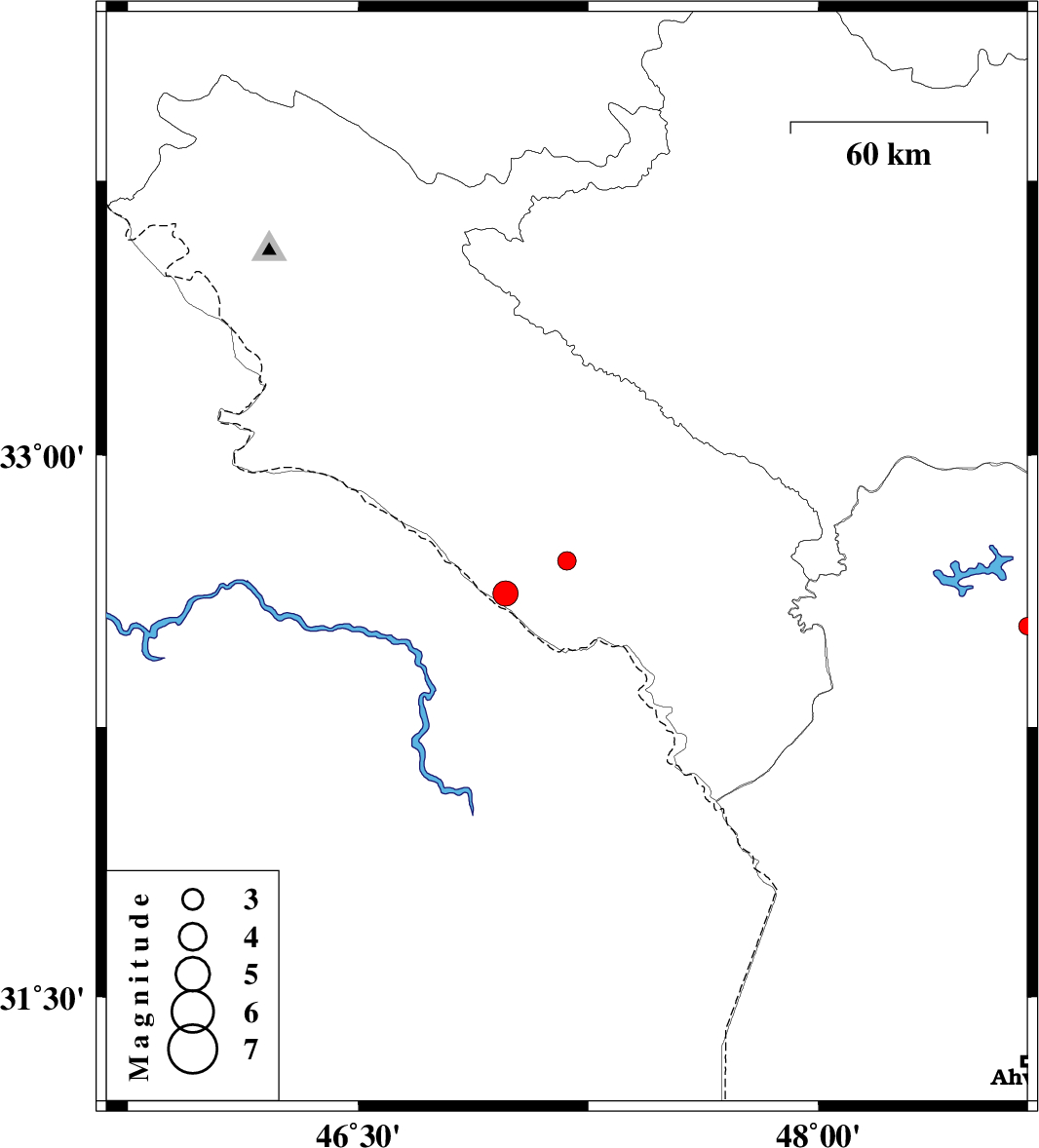 | 2012/06/06 | 01:44:25.7 | 06:14:25.7 | 32.53 | 48.68 | 14 | ML:2.6 | Khoozestan Province, 32 km East of Andimeshk |