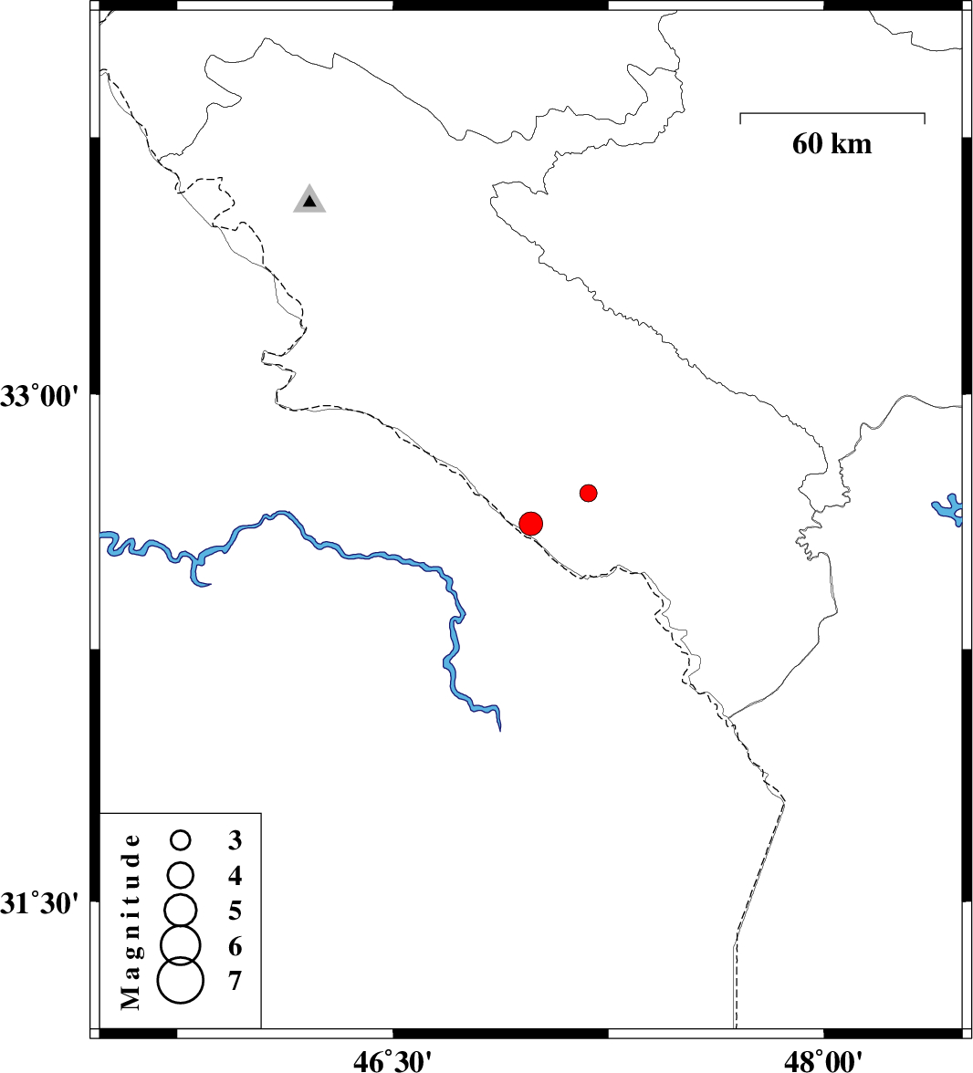 | 2012/06/08 | 05:32:29.9 | 10:02:29.9 | 32.62 | 46.98 | 18 | ML:3.7 | Ilam Province, 27 km West of Dehloran | ||
