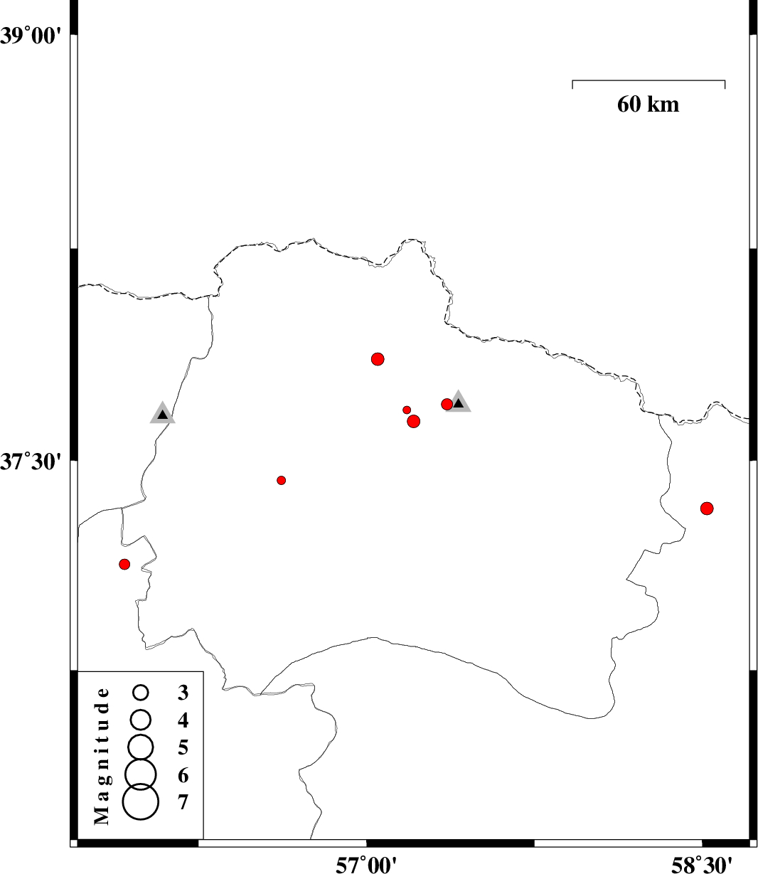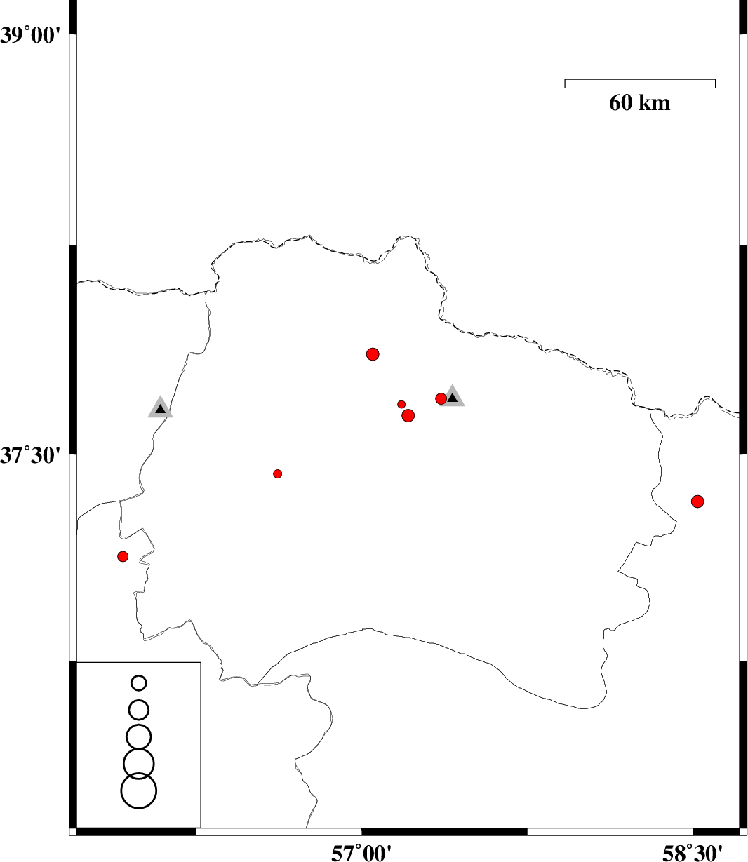 | 2012/06/05 | 06:04:34.3 | 10:34:34.3 | 37.68 | 57.18 | 14 | ML:1.6 | Khorasan(north) Province, 26 km North-West of Bojnurd | ||