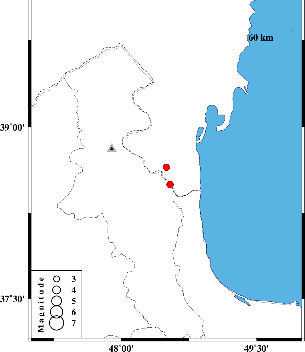 | 2012/05/14 | 06:46:23.1 | 11:16:23.1 | 38.5 | 48.54 | 14 | ML:3.5 | Ardebil Province, 10 km Namin |