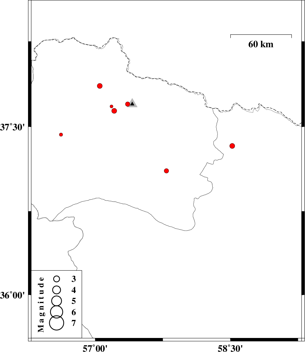 | 2012/06/07 | 12:58:05.7 | 17:28:05.7 | 37.7 | 57.36 | 37 | ML:2.2 | Khorasan(north) Province, 26 km North of Bojnurd | ||