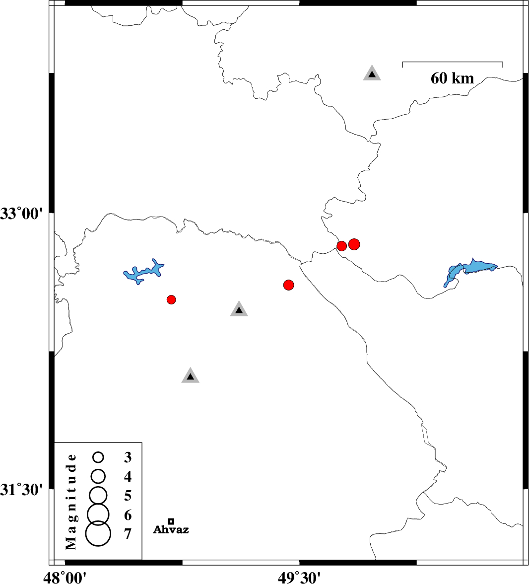 | 2012/06/06 | 01:44:25.7 | 06:14:25.7 | 32.53 | 48.68 | 14 | ML:2.6 | Khoozestan Province, 32 km East of Andimeshk |
