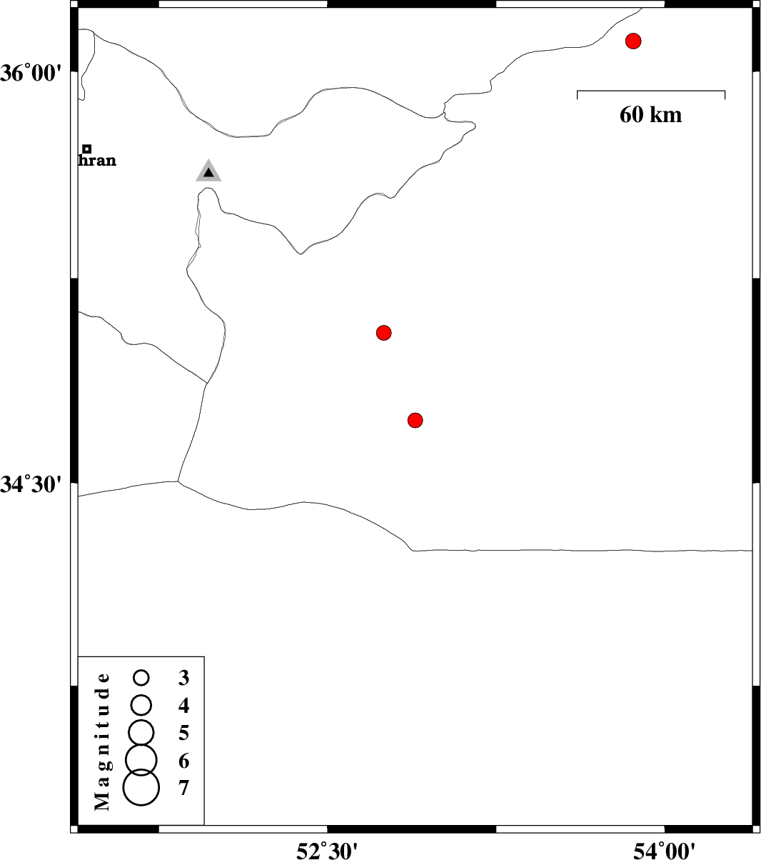 | 2012/06/13 | 23:20:42.6 | 03:50:42.6 | 34.73 | 52.89 | 14 | ML:2.9 | Semnan Province, 74 km South-East of Garmsar | ||