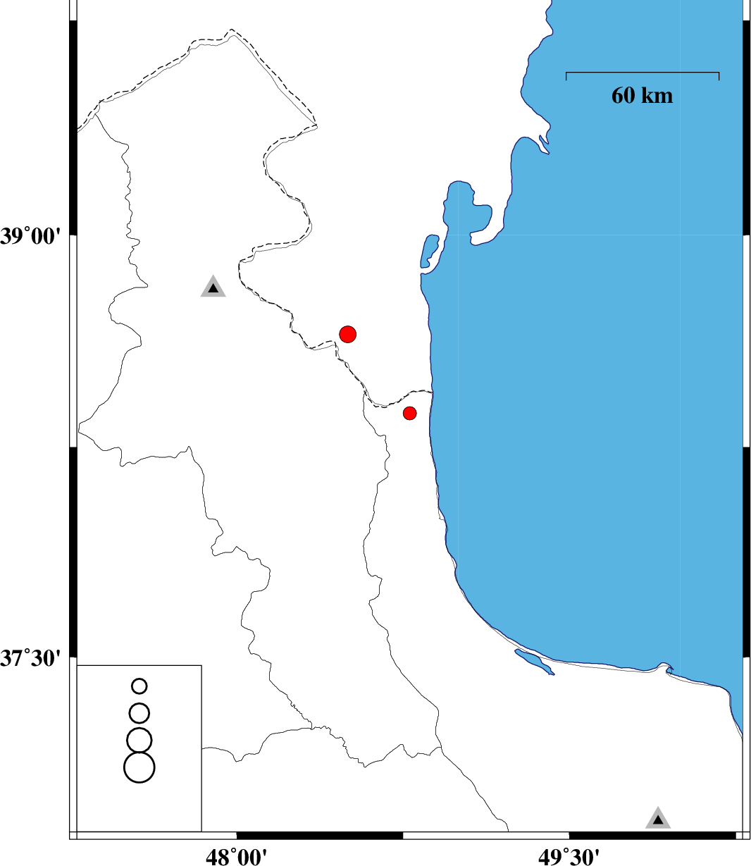| 2012/06/10 | 22:30:20.8 | 03:00:20.8 | 38.65 | 48.5 | 14 | ML:3.4 | Azerbaijan, 24 km North of Namin |