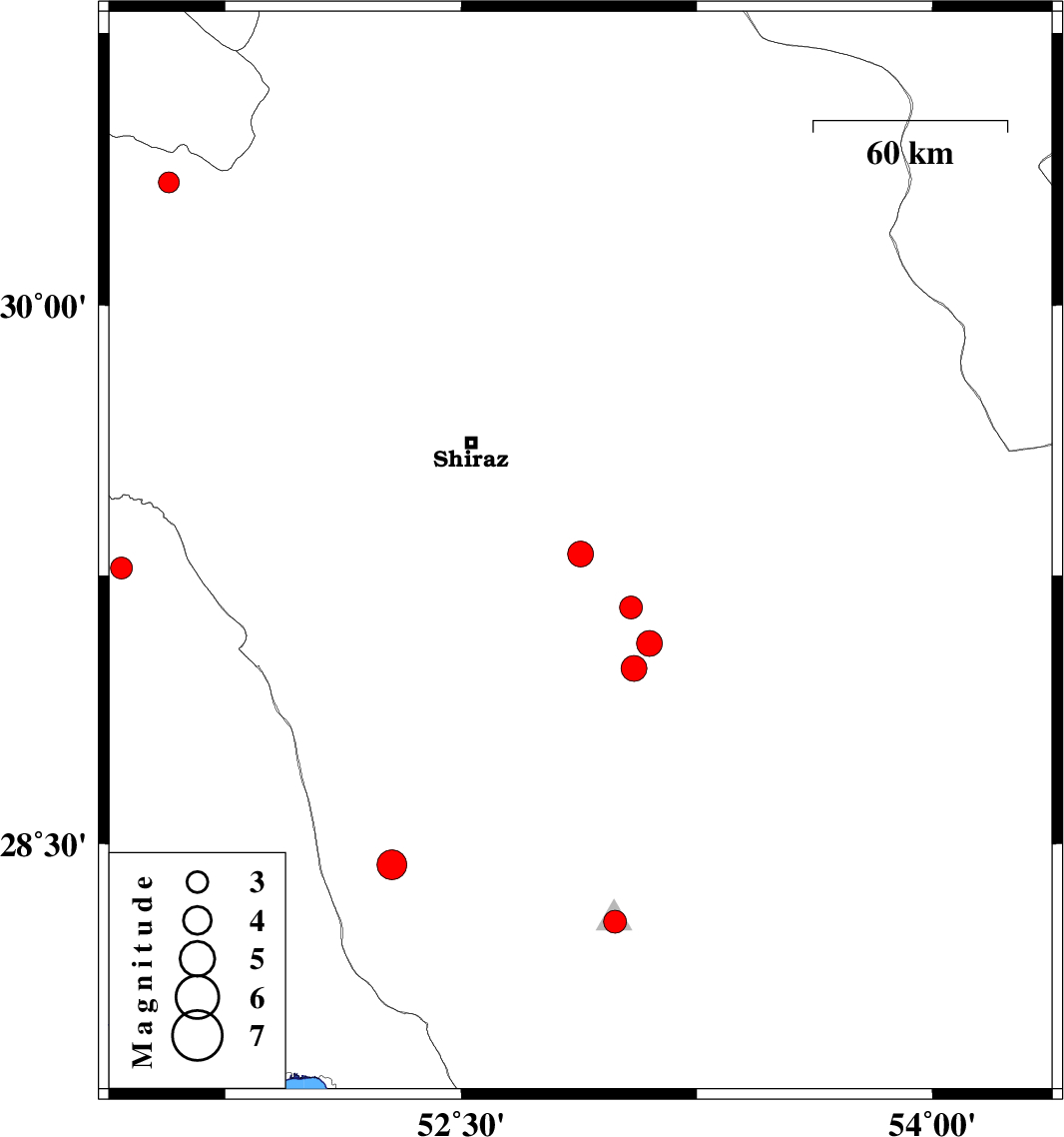 | 2012/06/16 | 19:23:20.7 | 23:53:20.7 | 29.31 | 52.88 | 15 | ML:3.7 | Fars Province, 63 km South of Marvdasht | ||