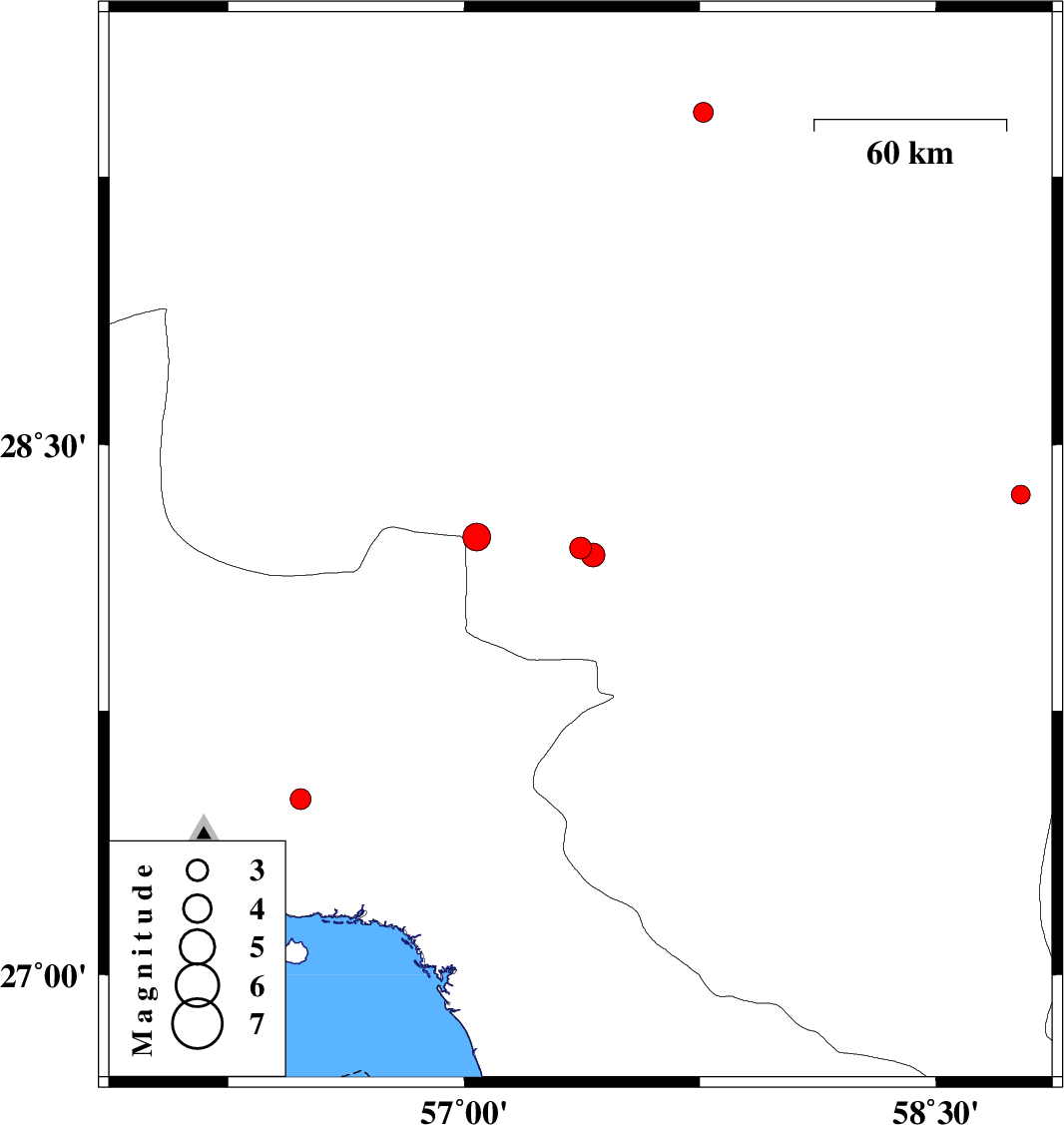 | 2012/05/28 | 10:12:01.8 | 14:42:01.8 | 28.36 | 58.77 | 14 | ML:2.7 | Kerman Province, 92 km South-East of Bam |