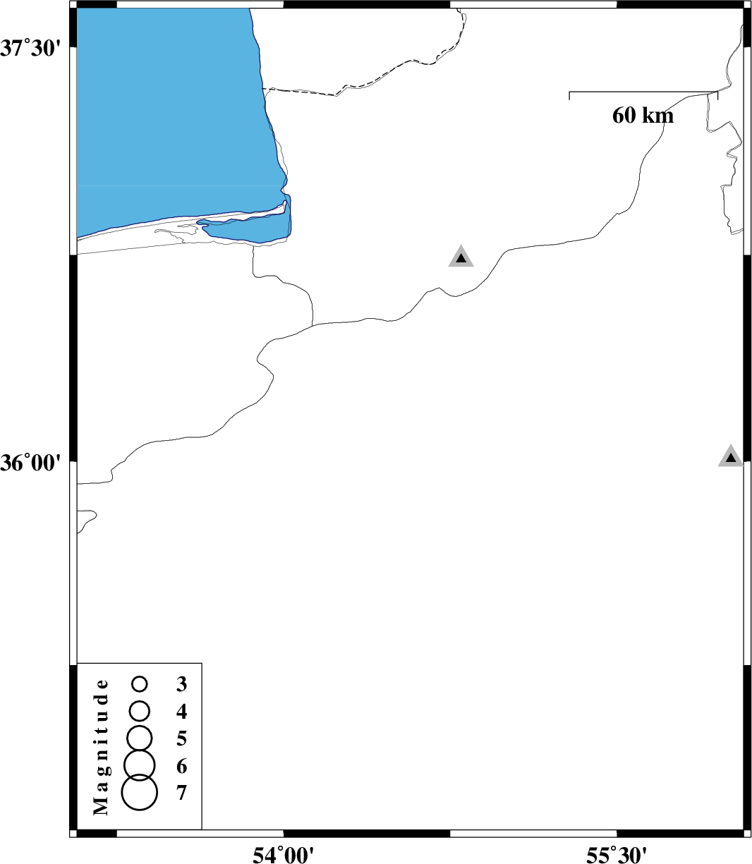 | 2012/06/19 | 07:55:20.8 | 12:25:20.8 | 36.14 | 54.57 | 14 | ML:3 | Semnan Province, 20 km East of Damghan |